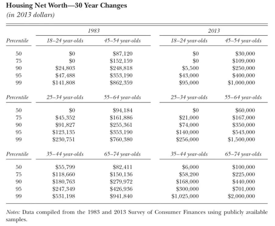 上图展示了1985-2013年间美国城市数不同房价/建造成本值的占比,可以发现在样本年份中,最大的特点在于房价与建造成本的比例高于1.25的城市占比随年份在上升,这些地区包含了美国最具生产力的城市。而且在过去30年,大部分美国人的房屋资产并没有得到较大的增长,但在住房被严格管控的城市里,年纪较大和较富裕的房主的房屋净资产得到了较大的增长。