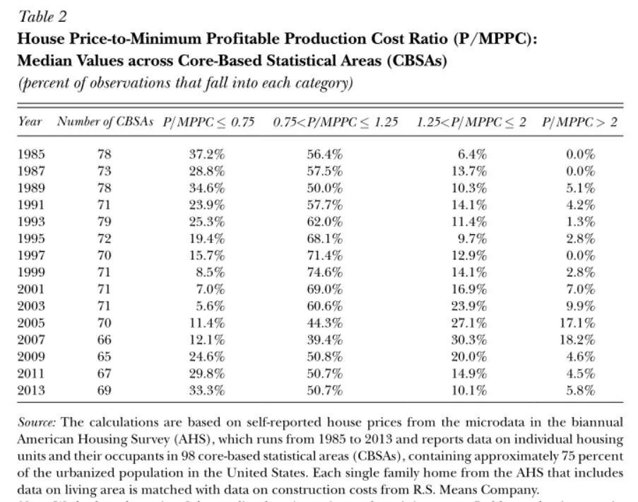 在这篇文章中,作者对美国的住房市场进行研究,通过构筑MPCC(minimum profitable production cost)这一指标衡量房价真实的建造成本,并与房价进行比较,发现在一些新增住房的供给被严格管控的城市,房价普遍较高,人口增速相对较小。