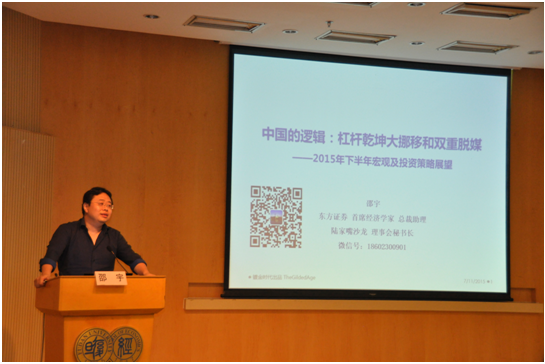 校外导师邵宇博士受邀给营员们做了一场深度的实务报告,报告题目为“中国的逻辑:杠杆乾坤大挪移和双重脱媒——2015年下半年宏观及投资策略展望”。