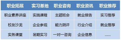 专业学位办工作的又一重要模块,针对专业硕士学生的需求建立了相应的职业发展体系,提供包括职业拓展、实习基地、职业咨询、职业资讯以及职业推荐等五类职业发展指导,通过职业素养讲座、实务课程、企业参观、实践课堂等多元化的载体对学生进行分阶段、全方位的职业发展教育。