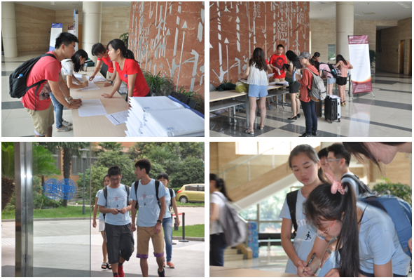 6日中午,夏令营志愿者们准时齐聚在经院大厅,为即将开始的营员报到做准备。志愿者们把入营指南、纪念品、餐券等仔细分类袋装,和营员衫一起整齐、有序地摆放着;引导牌、报名桌、登记册也摆放就绪。志愿者们分工明确、各就各位,为初来的营员们提供热情周到的引导服务。