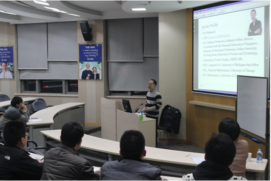 李克辛博士首先介绍了量化投资这门科学的基本涵义,从量化方法的定义、适用产品、客户出发,结合量化投资方法与传统方法的比较,让同学们对量化投资的基本应用有了一定的认识。介绍NM量化投资研究进展,量化投资的步骤分为:建模、编码、分析、交易,将数学模型及计算机编程技术,与现实的市场情况进行结合分析,以期获得理想收益。李博士强调技术分析并非量化投资,并从数理模型的角度详细讲述了量化投资策略中的移动平均线交叉理论,其中包括金融时间序列的经典性质、K-S-T过程、参数的估计、马尔科夫性、平稳状态等。基于前面的基本框架,李博士进一步地运用线性技术指标的数理分析这个例子加深同学们的理解。最后作为总结,李博士指出量化投资需要的技能,即金融感知能力、市场理解能力、创造能力,相关的数理基础,计算机编程能力等;并指出量化投资是一个新兴的领域,是数学与计算机科学在金融行业中碰撞出的火花,未来有可观的前景。
