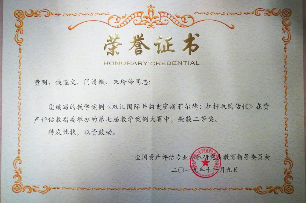2019年11月9日上午,从全国资产评估专业学位研究生教育工作会议上传出喜讯。我院黄明老师、钱逸文同学、闫清徽同学、朱玲玲同学撰写的《双汇国际并购史密斯菲尔德:杠杆收购估值》在第七届资产评估硕士教学案例大赛中荣获二等奖(仅有的两项二等奖之一)。