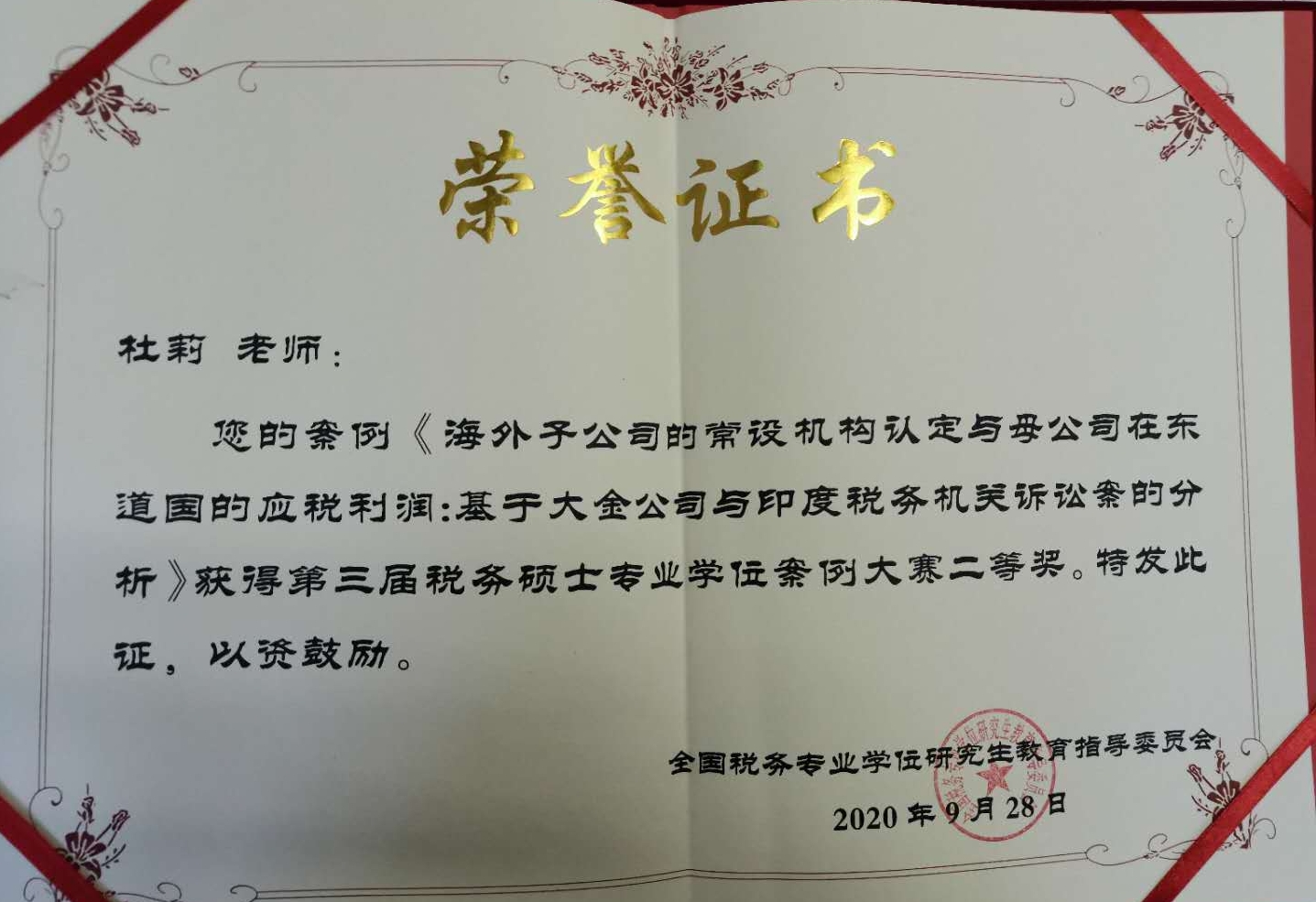 这已经是杜莉老师连续三届获得全国税务专硕教指委案例奖项,此前,杜莉老师分别荣获第一届税务硕士专业学位案例大赛三等奖,第二届税务硕士专业学位案例大赛二等奖,祝贺杜莉老师!祝贺学院税务硕士项目!