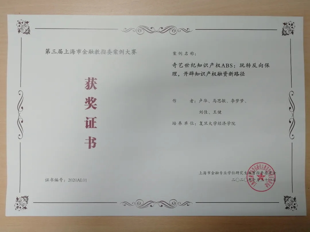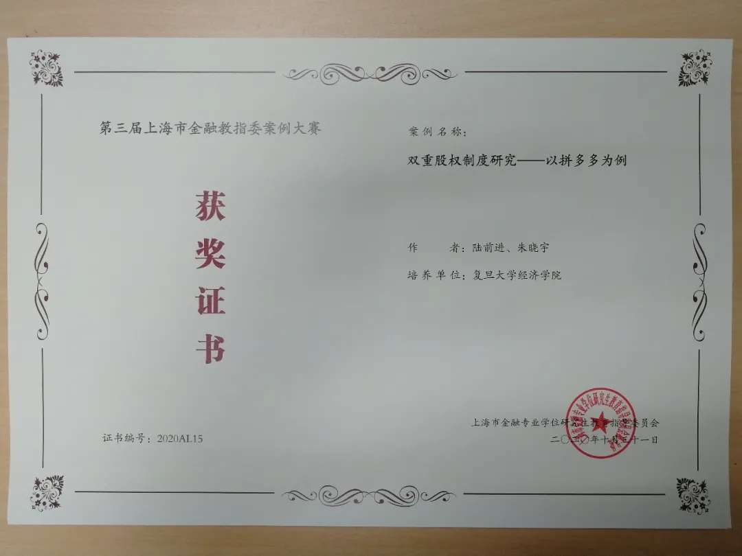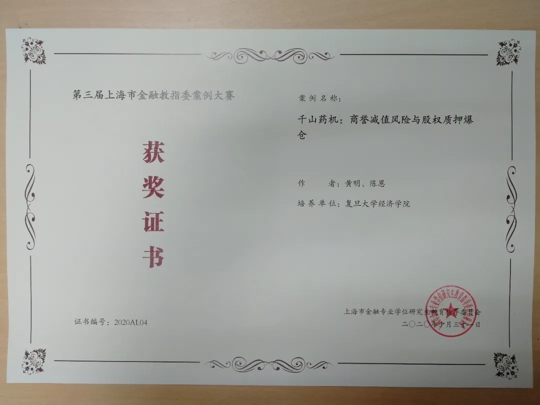 黄明老师、陈恩撰写的《千山药机:商誉减值风险与股权质押爆仓》,卢华老师、马思敏、李梦梦、刘佳、王健撰写的《奇艺世纪知识产权ABS:玩转反向保理,开辟知识产权融资新路径》,陆前进老师、朱晓宇撰写的《双重股权制度研究——以拼多多为例》,孙琳老师、潘欣撰写的《中国平安:百亿股票回购计划》,孙健老师、徐辉撰写的《Libra:数字货币对金融体系的冲击与重构》在第三届上海市金融教指委案例大赛中获得优秀案例奖。
