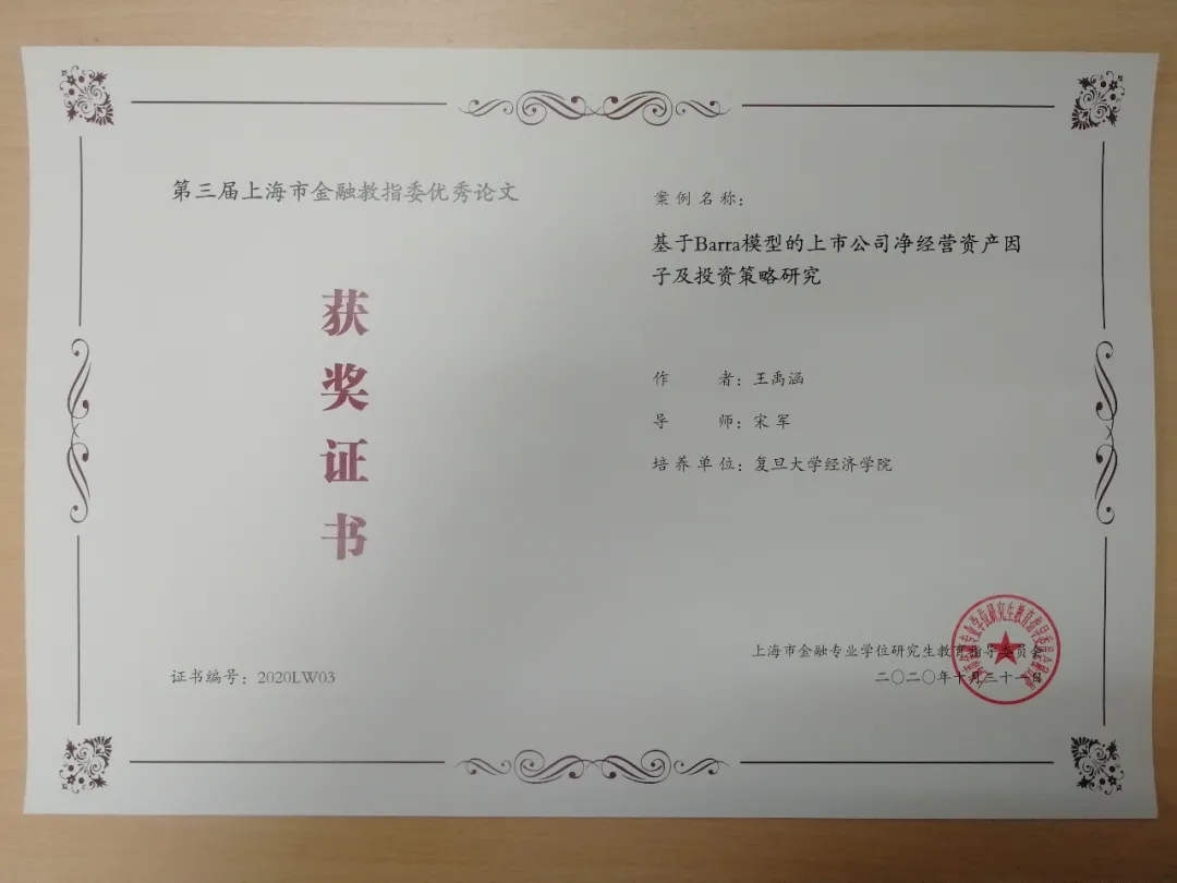 由宋军老师指导王禹涵同学撰写的《基于Barra模型的上市公司净经营资产因子及投资策略研究》,蒋祥林老师指导郑琳凯同学撰写的《模型不确定性下的全球资产配置》,罗忠洲老师指导董方红同学撰写的《股票涨停后的投资者行为研究》在第三届上海市金融硕士优秀论文评选中荣获优秀论文奖。