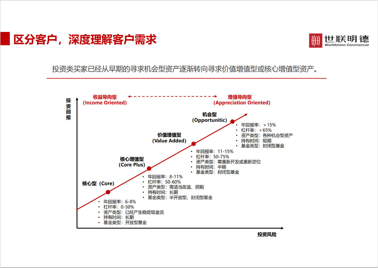 写字楼资产管理的核心在于现金流管理。写字楼的管理是一项长期过程,合理的租金预期和出租率预期有利于提升该项投资的确定性,保证项目现金流的充足性和使用效率。投资项目落地后,投资人需要进行前期及开发期的资产管理工作,对写字楼进行规划和招商。租赁开始后,运营方需要进行客户关系的维护与管理、物业管理等。良好的管理可以有效满足客户需求,提升客户体验,保证预期租金价格和预期出租率的实现,进而保证预期现金流的实现。