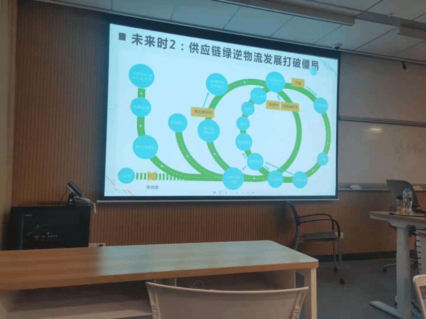 在绿色供应链的展望部分,胡老师指出,供应链环境责任的两大任务是供应链合规风险管理和供应链环境绩效管理。习近平总书记于2018年5月提出针对环境治理问题要“从全局角度寻求新的治理之道”,而绿色供应链管理则体现了习近平生态文明思想中的系统性、整体性、协同性理念。同时,胡老师提出,在绿色供应链的体系中,企业获益来自于提高企业竞争力、提高客户满意度以及加强供应链各节点间的合作,未来关注的点在于供应链环境信息流共享和供应链绿逆物流。