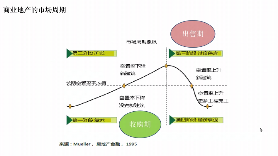 在财务分析基础这块,陈老师总结了商业地产的市场运作周期,和经济周期类似,也同样包含复苏、扩张、过度供应和衰退四个阶段。