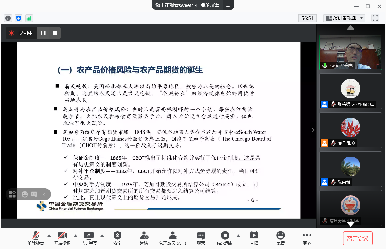 张老师的讲座主要从四个部分展开:第一部分是全球期货与衍生品市场发展历史与现状,第二部分是我国期货与衍生品市场发展历史与现状,第三部分讲述了我国金融期货运行情况和应用场景,第四部分和同学们分享了几个有待探讨的问题。