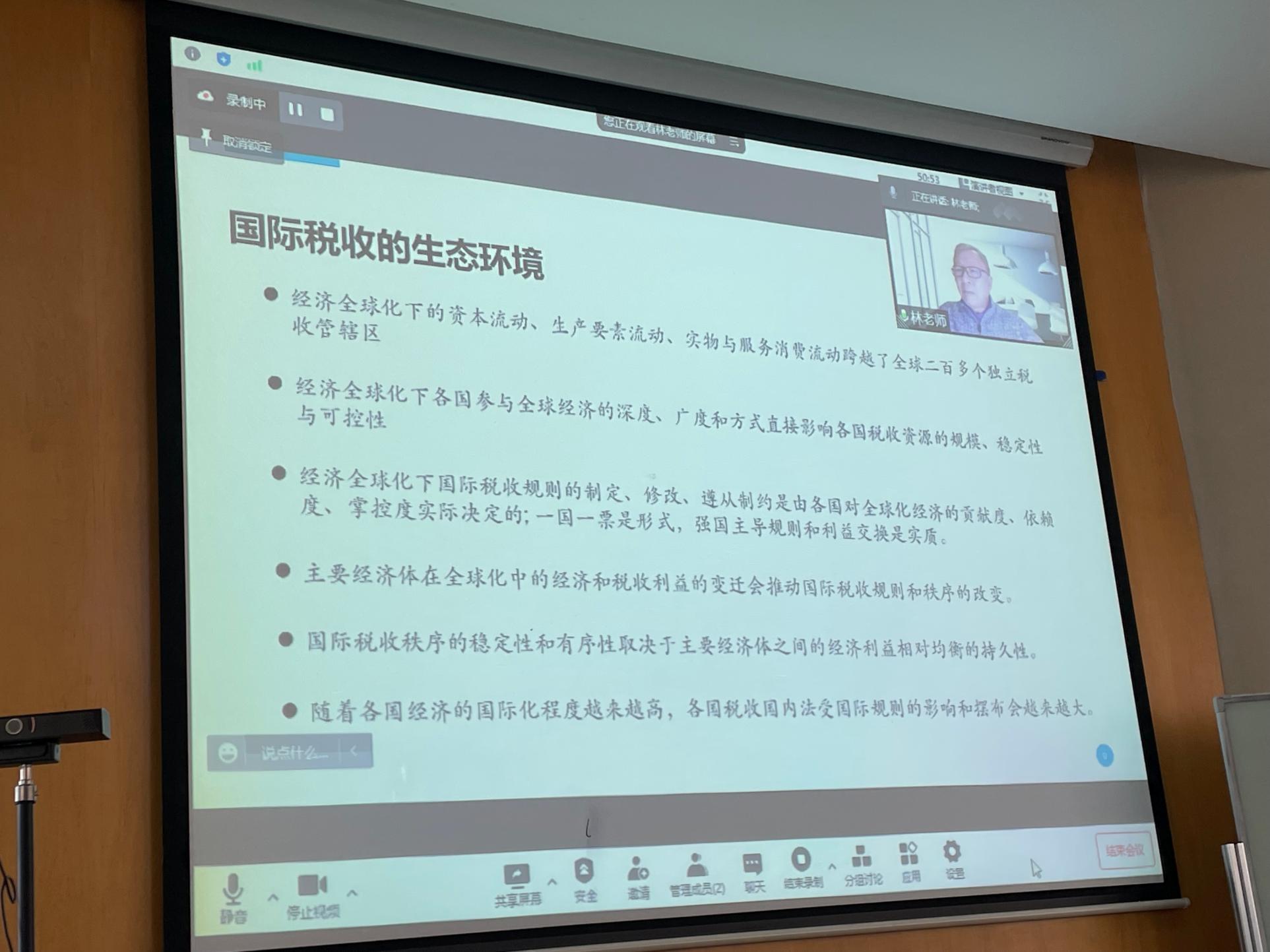 在接下去三个月的课程中,林老师还将与同学们一起探讨税收协定、常设机构、跨境服务与无形资产安排、跨国经营产业链安排等方面的国际税收实务问题。