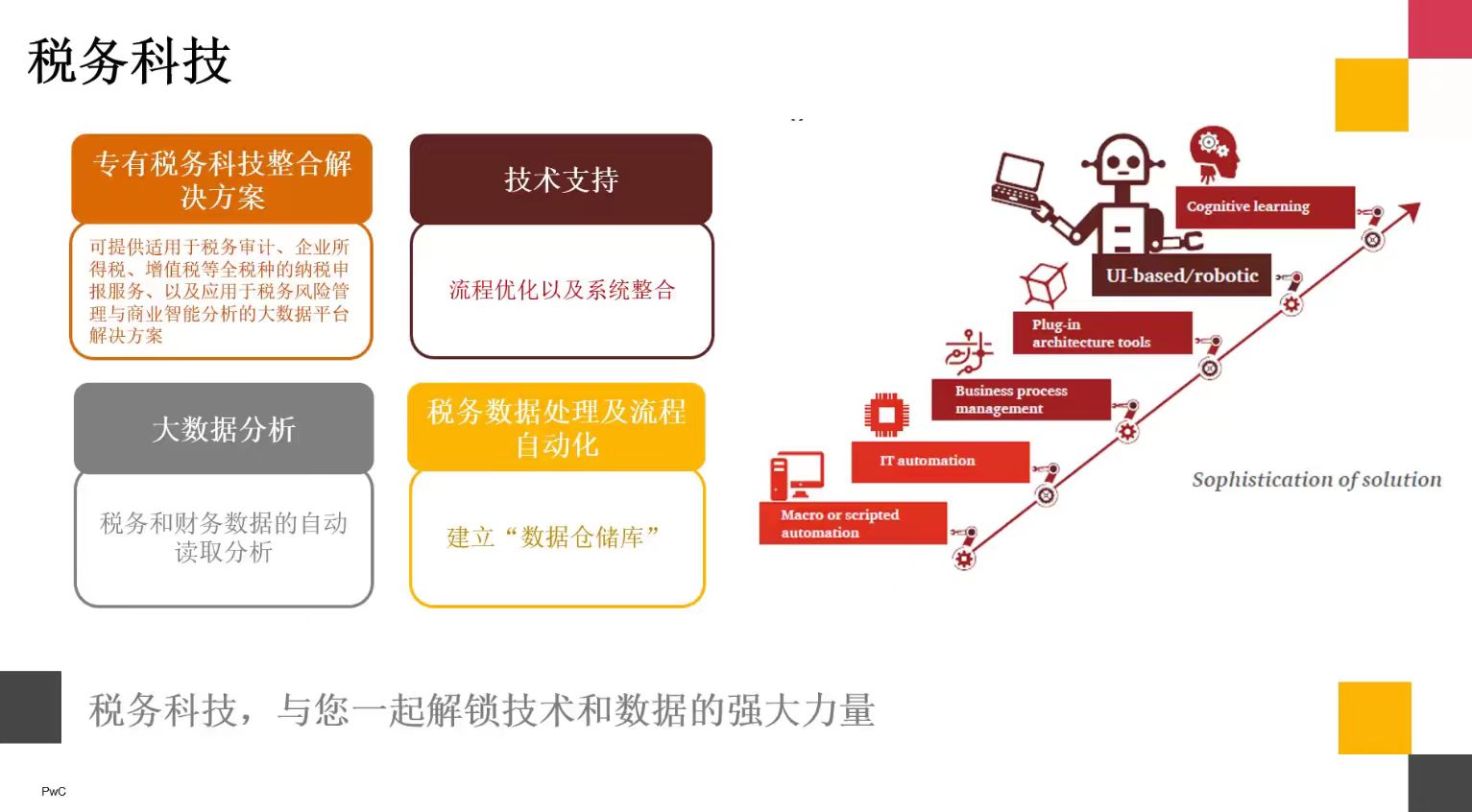 接下来,马静老师简要介绍了普华永道税务团队实现科技流程自动化的几个具体业务场景,以及普华永道为客户提供的全税种管理平台,分析了全税种管理平台能满足客户的五大需求层次:①税务合规需求,满足财务总监足不出户了解全球子公司具体税务申报情况的需求,便于统一管理;②数据分析和整理需求,系统化、自动化的管理平台形成数据归集及可视化,呈现集团整体税务全貌;③税务法规发展情报需求,实时更新各国税务法规最新动态,并分享专业人士的洞察;④税务筹划需求,通过全局的数据和分析,寻找筹划空间,优化整体架构;⑤税务风险示警需求,通过税务指标监控,提示税务风险,助力企业主动解决税务风险。