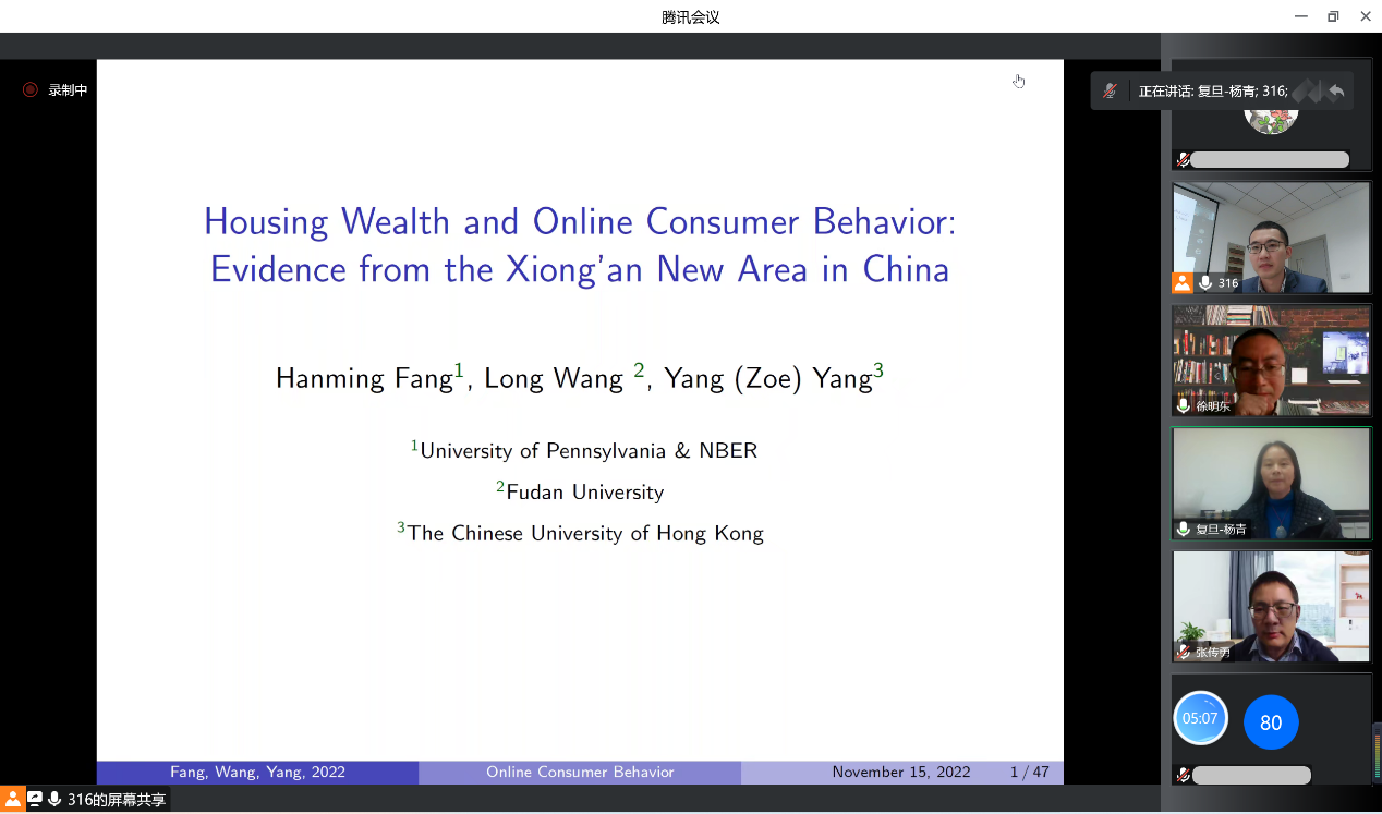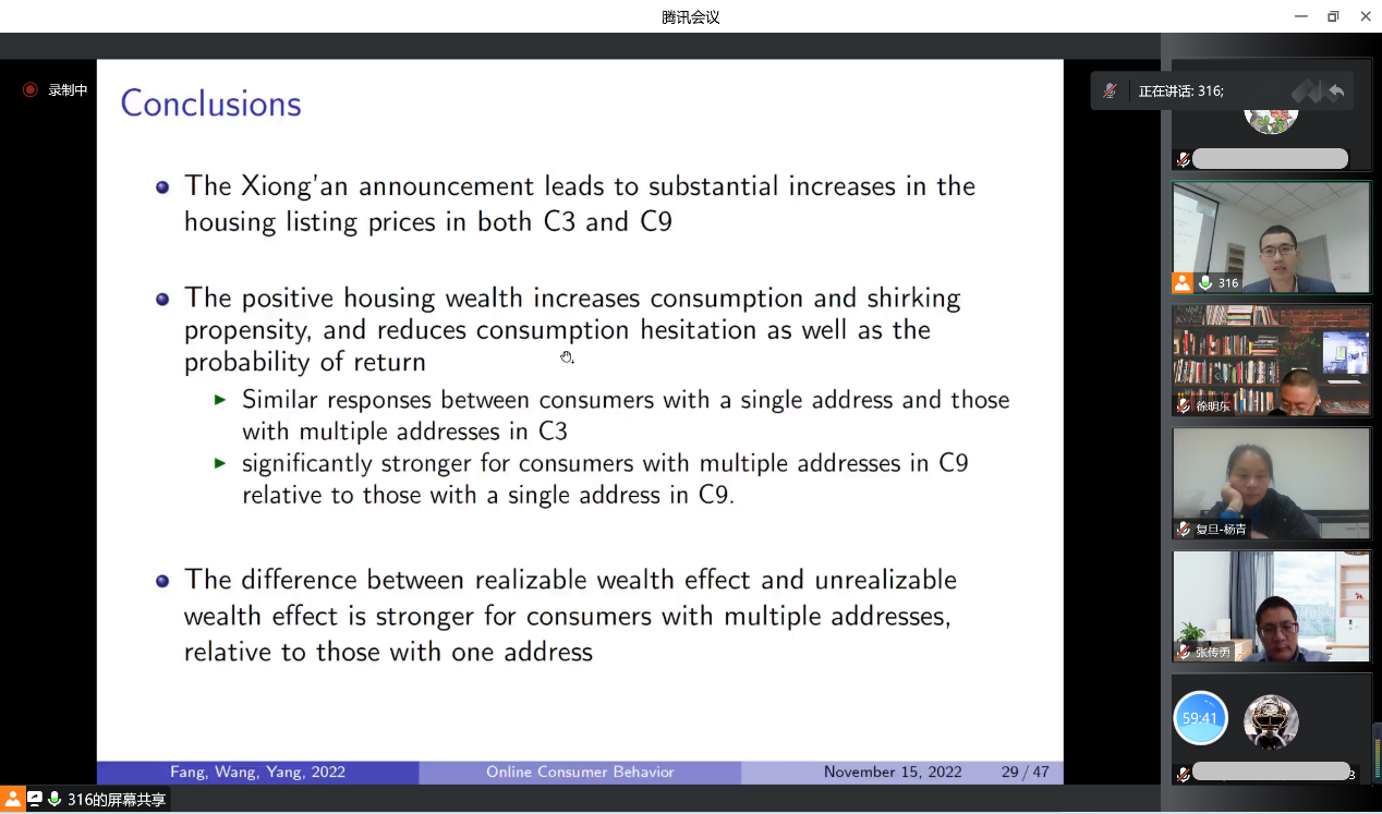 在点评环节,张传勇副教授肯定了这篇文章的特色与贡献,并围绕消费的季节性特征和线上消费群体的年龄结构对实证结果的影响提出了独到的看法。徐明东副教授对文章的选题切入点和研究设计给予了高度评价,同时提供了更多实证层面的可能性。王老师与两位点评人充分交流,帮助同学们对房产财富和消费行为的关系有了更为全面和深刻的理解。