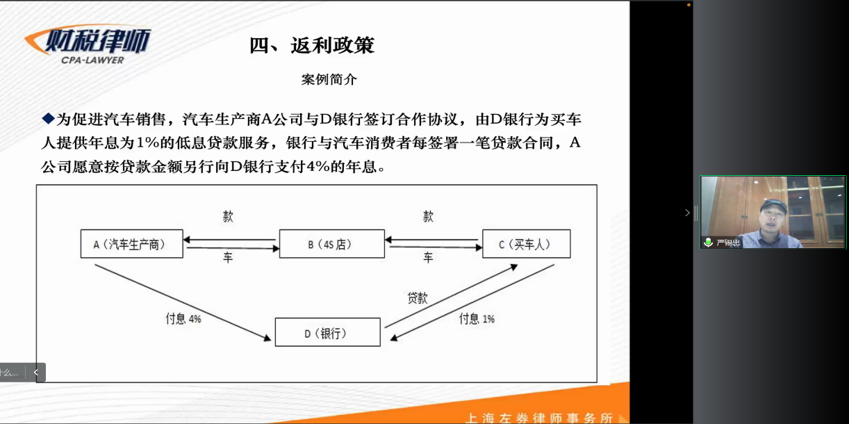 针对第二个问题,严老师提到,要想达到同样的商业效果,解决税收和商业之间的冲突,那么可以通过让制造商和买车人签署对应的协议,让买车人授权给制造商,如有返利,让制造商把款项直接支付给银行。