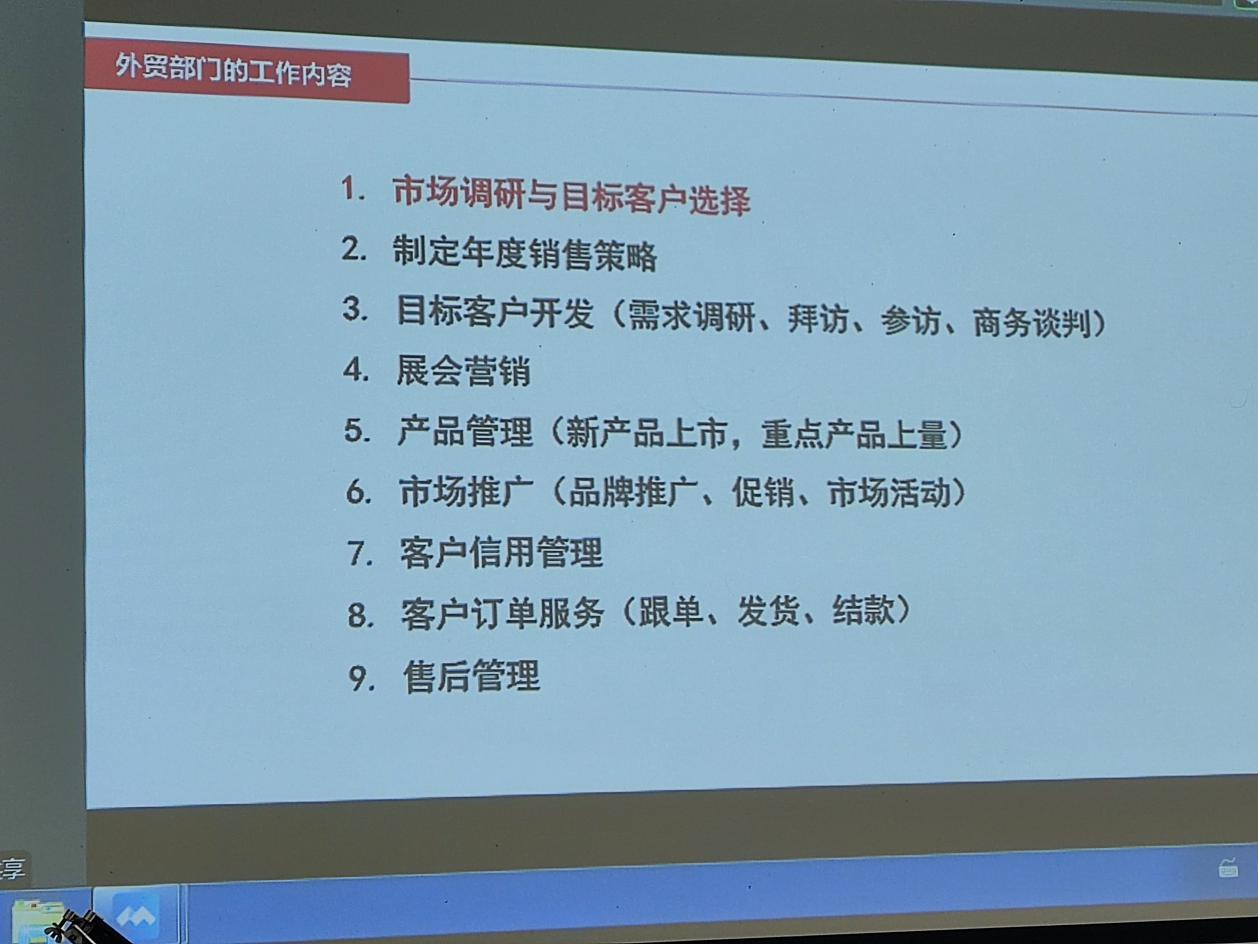 首先,徐老师介绍了我国外贸发展阶段和企业外贸部门的相关背景知识。第一,我国对外贸易发展经历了外贸经营管理体制、对外贸易口岸主导、进出口公司主导和有竞争力的生产商主导等五个时期。第二,企业外贸部门的作用在于帮助客户做风险管理,需要考虑价格、质量、运输等多方面因素。第三,企业外贸部门的工作内容涉及微观主体对外贸易的全过程,包括市场调研与目标客户选择、制定年度销售策略、目标客户开发、展会营销、产品管理、市场推广、客户信用管理、客户订单服务和售后管理等九个方面。