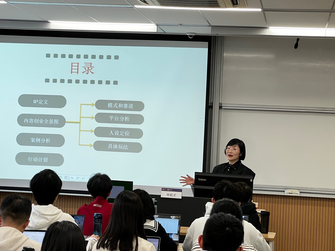 然后,杨老师介绍了如何打造IP。她指出,一是要确定自己的模式,打算选择什么赛道,选择主攻什么样的平台。二是要考虑自己的优势、兴趣爱好、天然的人设和故事,以及与别人的差异和特殊技能水平等方面。三是要进行创意推导和创意输出,提高个人品牌影响力。杨老师鼓励同学们将自己的想法付诸实践,并不断提升自己的创意水平和影响力,打造出有价值的IP。
