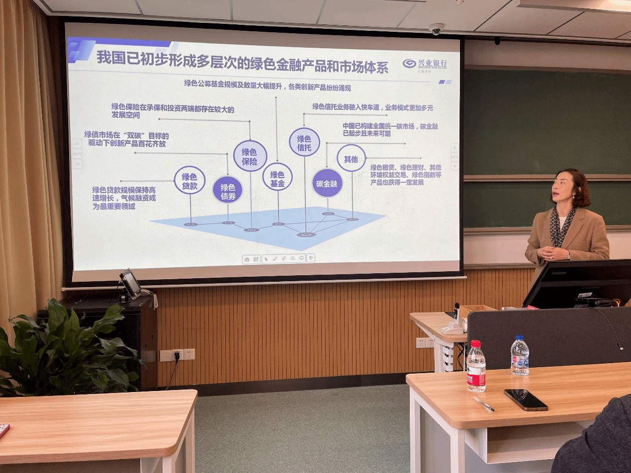 最后,付老师分享了兴业银行参与的“华电福新能源有限公司并购融资”等绿色金融实务案例,让同学们更直观地感受到绿色金融对环境保护带来的益处。同时,付老师讲解了绿色金融业务未来的创新方向,例如个人绿色贷款,让同学们了解到了绿色金融实践领域最前沿的信息。