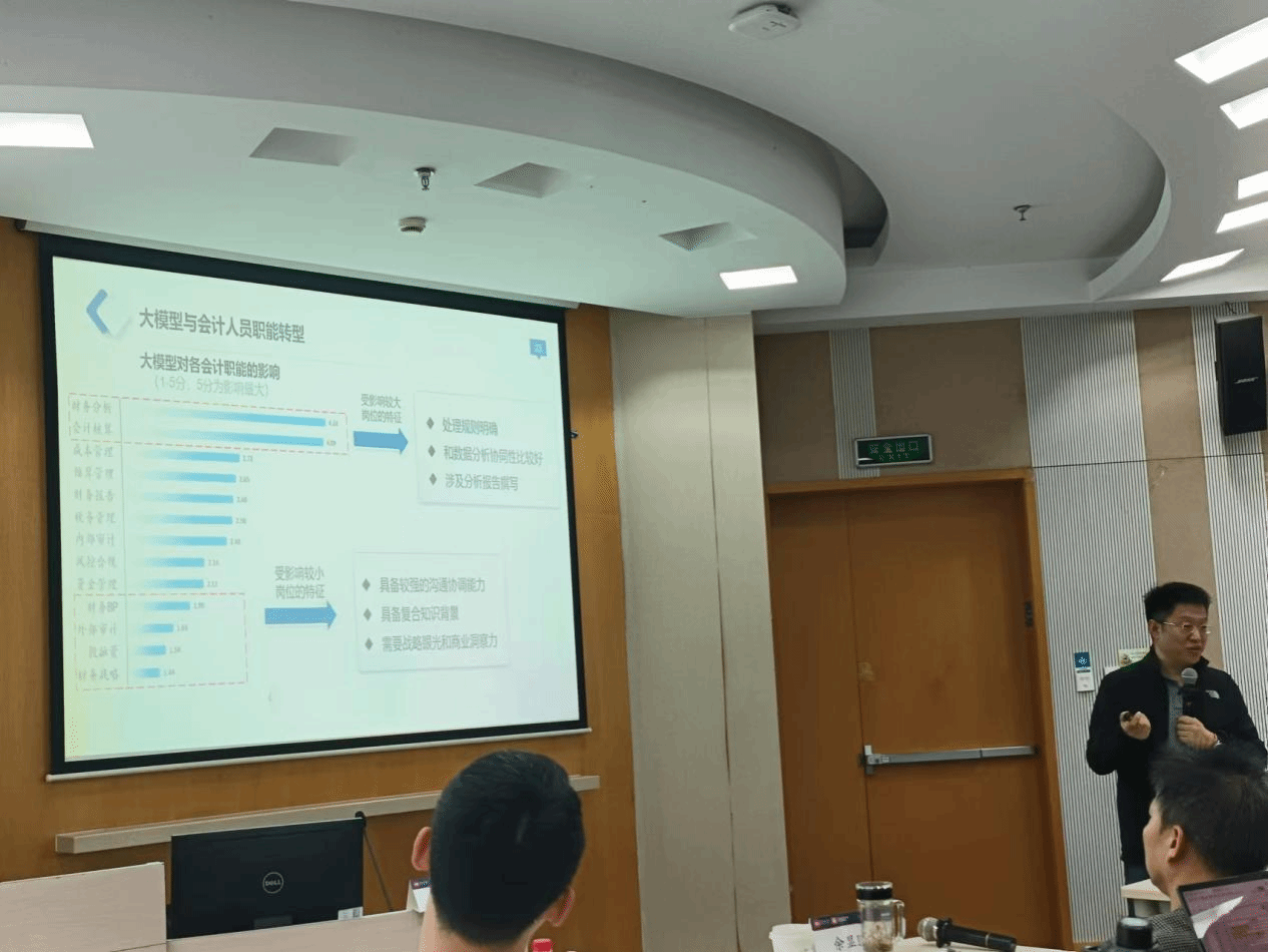 随后,金老师介绍了他之前联合上国会智能财务研究院、上国会会计信息调查中心进行的问卷调查:ChatGPT为代表的大模型对会计人员职能转型的影响,覆盖对象包含全国会计领军人才在内的样本库,共搜集有效问卷1173份。问题设置包括:被调查者的基本信息、会计人员对AI大模型的认知和看法、针对AI大模型影响的应对现状等。问卷调查得出的最终结论是:AI大模型对各会计职能影响最大的是财务分析与会计核算,其特点是处理规则明确、数据分析协同性比较好、涉及分析报告的撰写;影响最小的是外部审计、投融资与财务战略,其特点是要求具备较强的沟通协调能力、复合知识背景、战略眼光和商业洞察力。