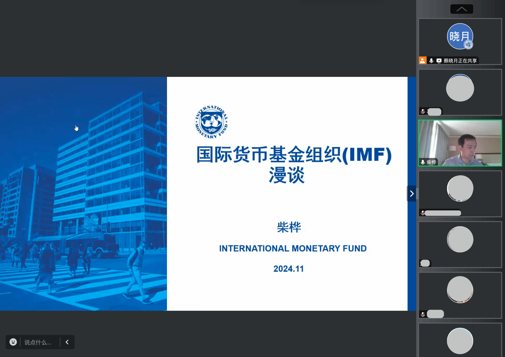 柴老师的讲座主要分为两个部分:第一部分是IMF的运作概况,第二部分是IMF的职业前景以及问题解答。