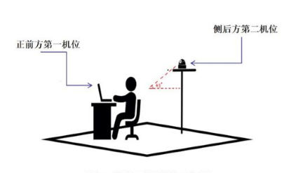 5、采用“双机位”进行考试(如下图所示),请提前调试好机位。正前方第一机位摄像头,确保能够拍到考生头部及双手(建议设备:带摄像头的电脑);侧后方第二机位摄像头要保证能够从侧后方拍摄到考生本人、考试环境和考试屏幕,第二机位设备仅用于监控考试环境(建议设备:手机/IPAD/电脑)。