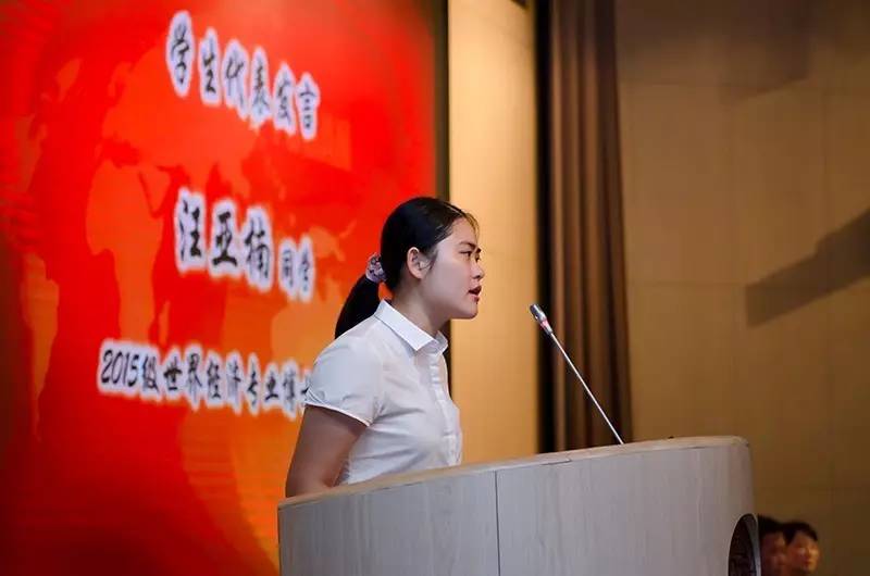 在庄严的国歌奏唱声之后,2015级世界经济专业博士研究生汪亚楠同学作为学生代表发言,汪亚楠同学热爱学术研究,曾先后荣获硕士国家奖学金、博士国家奖学金、2016年首届女性创业大赛三等奖、日本av片