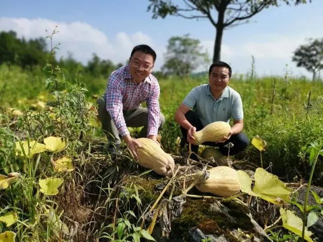 李国文(图左)在正安县庙塘镇茶台村蜜本南瓜产地