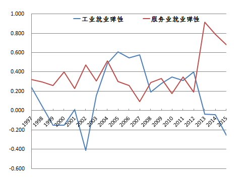 在经济增长大幅度下滑的情况下,政府是如何做得到创造那么多的就业岗位的呢?为了回答这个问题,先让我做个简单的演示。如果我把GDP的增长率作为分母,把就业增长率作为分子,那么这个比率就是所谓的经济增长的就业弹性系数。如果我再把制造业跟服务业分开来,那么我马上就看到,服务业GDP的就业弹性系数在2012年以后出现了不可思议的上升,而制造业的就业弹性系数则大幅度下降。