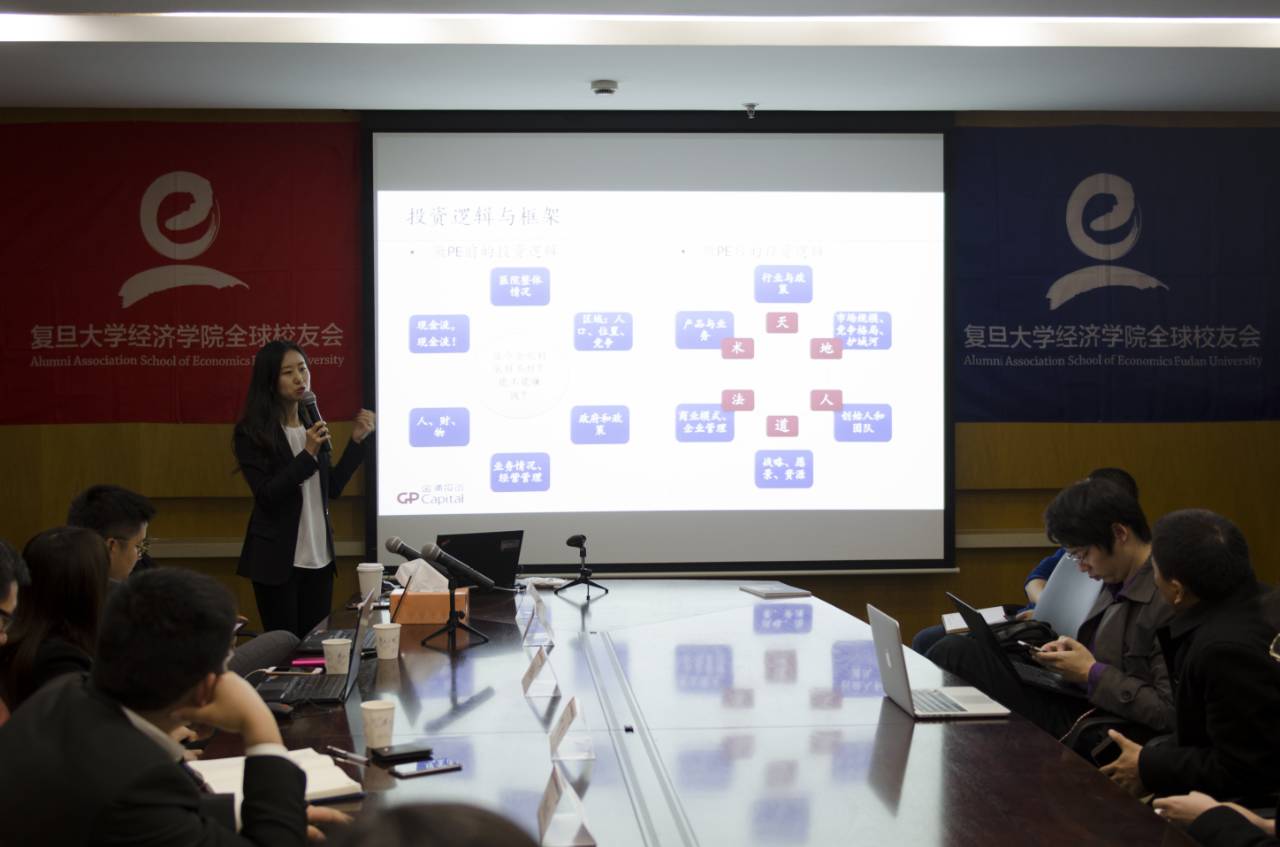 接着,金浦健服的高级投资经理邵一广先生介绍了自己的投资经历。首先,邵一广介绍了医疗服务行业业态,确定了投资主线——专科/综合医院连锁优于单体民营医院,单体民营医院优于参与公立医院改制。在邵一广看来,投资可以分为五个阶段,发现、拥有、提升、放大、实现价值,并结合投资项目邦尔医疗对这五个过程进行了梳理。第一,在发现价值方面,他强调好的行业、公司、团队、退出渠道都非常重要,并用数据对邦尔医疗所在的骨科行业、公司与团队以及退出渠道进行了详尽的分析。第二,拥有价值阶段包括接触项目、尽职调查、谈判、签署交易文件,尽职调查包括商务尽调(行业、技术、运营)、法务尽调(历史沿革、土地产权、公司架构)、财务尽调(财务真实性、规范性、债权债务),商业谈判包括估值、交易架构、董监事安排、反稀释、安全边际等等。第三,提升价值也就是投后管理阶段,他强调投资人要充当绿叶,不插手公司的管理,主要帮助企业进行资源对接、上市辅导、后续融资以及业务发展跟进。对接给企业的资源包括政府资源、金融资源、医疗资源和产业资源;在上市辅导方面,可以帮企业对接审计、律所、券商团队以及证监会资源;此外还要关注企业交易文件规定事宜的完成进度,帮助企业塑造品牌。第四,放大价值阶段主要是战略协同与并购整合,包括上市前产业整合与上市后市值管理,帮助企业进行业务扩张。这点在医疗服务投资领域尤为重要,通过横向并购整合,迅速做大规模实现全国布局,尽早得去与资本市场对接。第五,实现价值阶段,通过前面四个阶段的努力与最后的退出,为LP获得财务回报或者实现产业布局。最后,他将“脚踏实地、心系远方”这八个字送给了在座的学生,鼓励大家勤勉学习,不断前进。