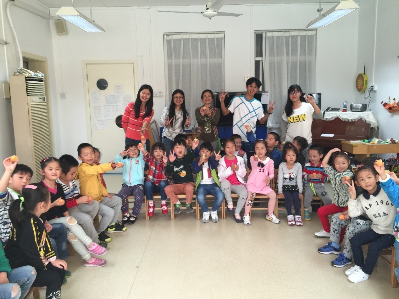 队员介绍:包钰、梁爽、施嘉晨、郭芳君。四个志愿者先来到了杨浦区少儿图书馆,做志愿者活动前的准备。准备好后,志愿者带着材料跟着图书馆的张老师和故事妈妈一起来到了杨浦区民星幼稚园。幼儿园的小朋友们正乖乖地坐在小板凳上听老师讲话。