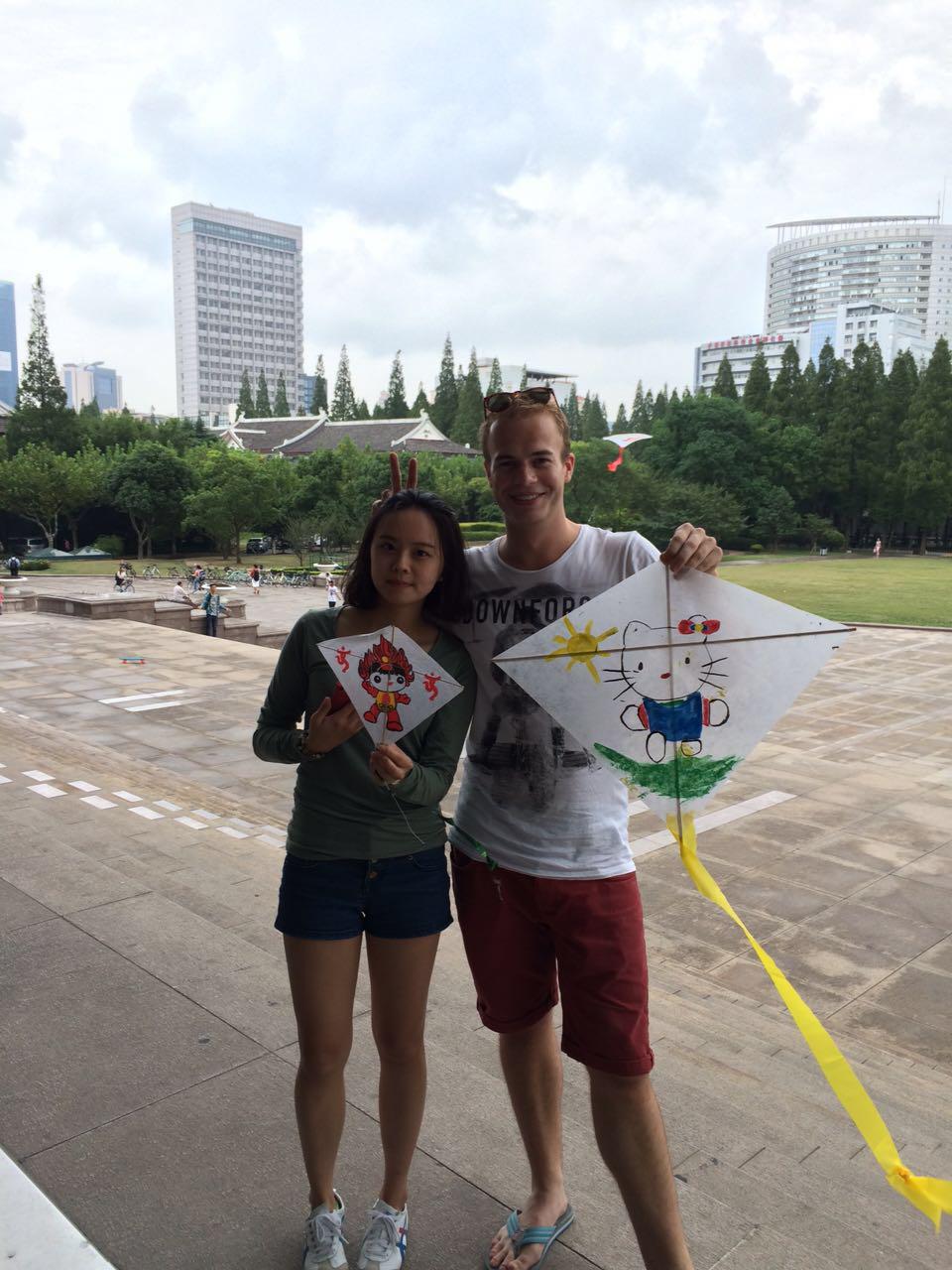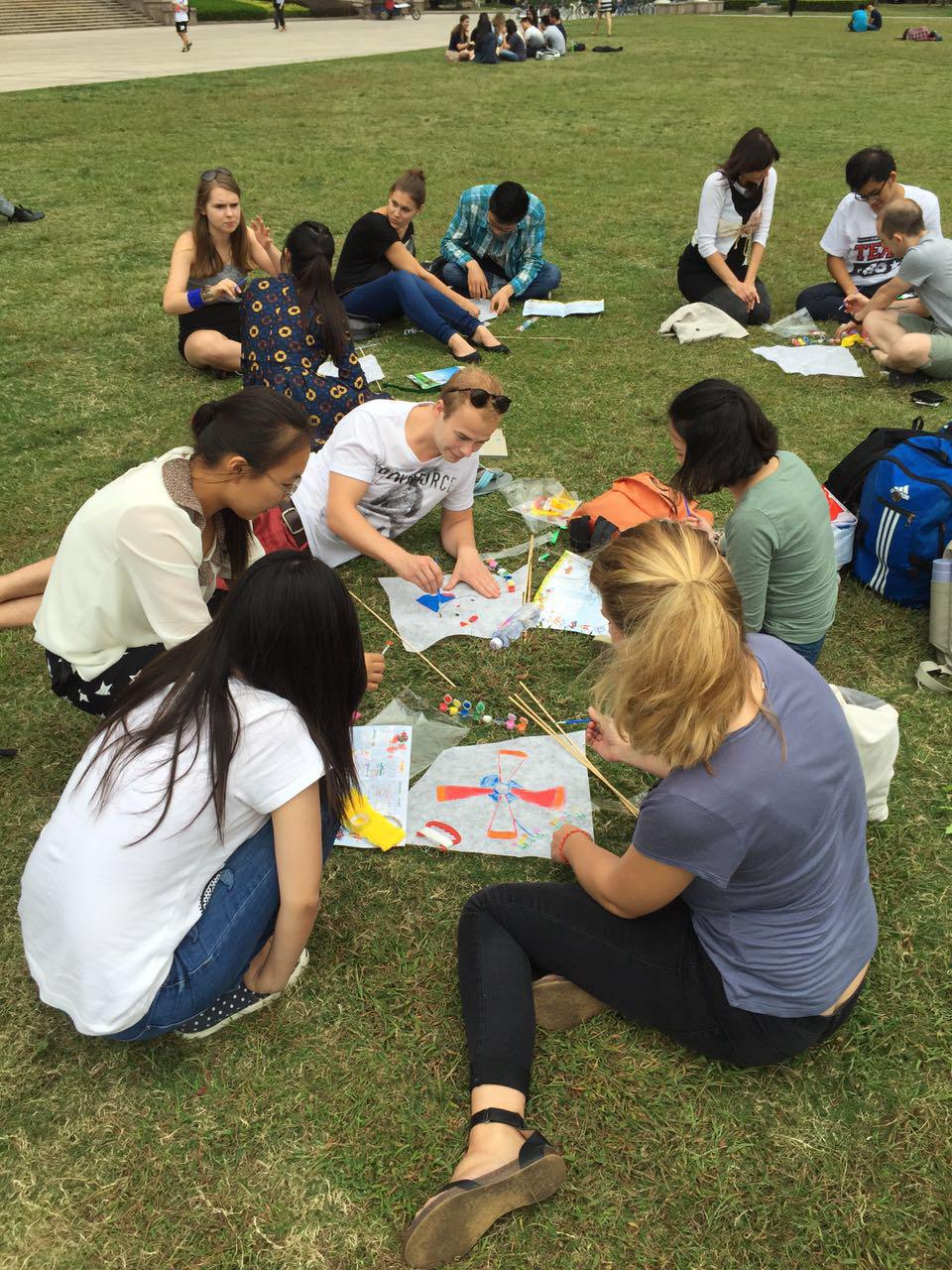 15时30分左右,活动准时开始。首先我们进行了制作风筝的活动。中外学生每2-3人组成一组,用纤维纸、木条、双面胶、单面胶、颜料、画笔等材料制作风筝。大家先用画笔和颜料在风筝面上画出喜爱的图案,再用双面胶将木条粘上纤维纸,形成风筝的骨架,最后再贴上风筝的尾巴,固定好风筝线。大家一边制作,一边交流,渐渐打破初识的陌生感,在轻松愉快的互动中,增进了彼此的了解。
