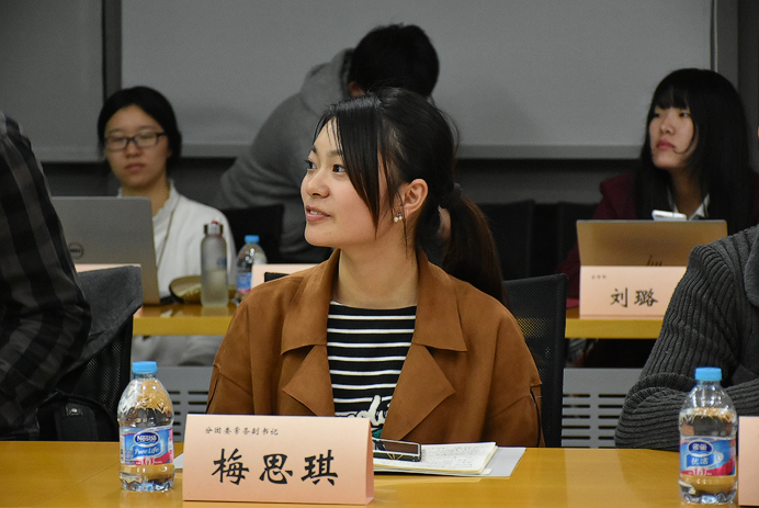 刘栋主席介绍完毕后,广州大学经济与统计学院团委学生会主席何晶晶介绍了广州大学经济与统计学院的概况及该院团委学生会的组织构成、绩效考核及特色活动等。何晶晶主席重点介绍了“财富论坛”、“青马工程”等特色活动以及团委学生会以“挂科退部制”为代表的一系列富有创新精神的绩效考核制度。