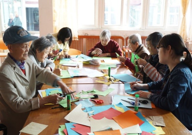 另一组志愿者和老人一起完成剪纸拼贴课程。同学们帮助老人在纸上画好图形,老人拿剪刀将图形剪下来,并按照老师的模板贴成一副画。老人们可能因为年纪大了手指不太灵便,但他们依然十分努力地按照老师的要求完成了任务,作品非常不错,受到了老师的夸奖。