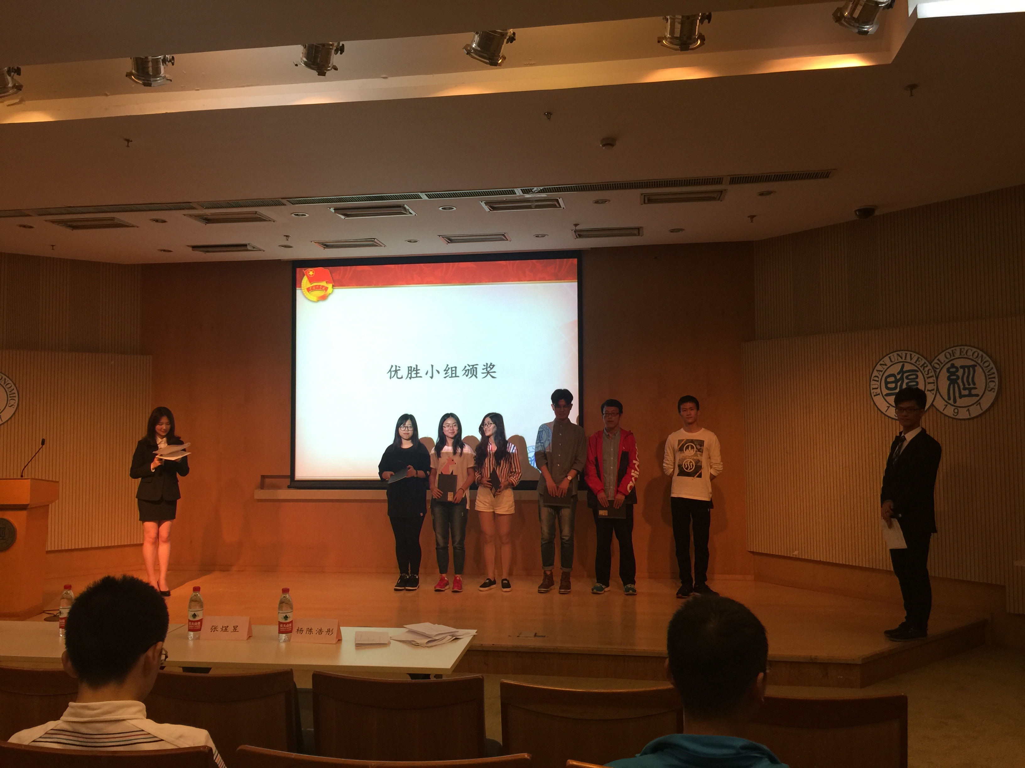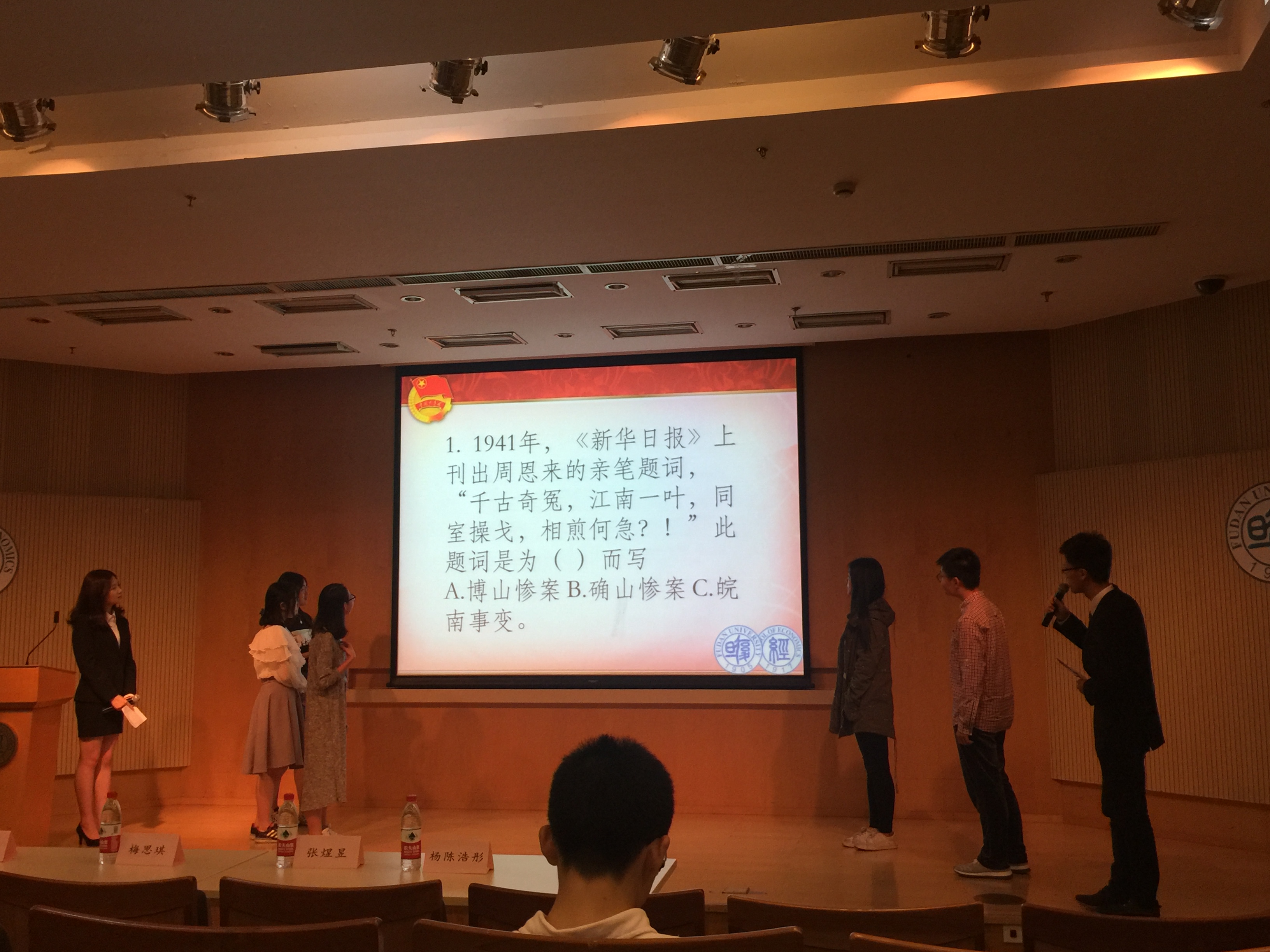 学员们依照团校手册分为五个小组,首先进入第一轮比赛,每人轮流回答一题,答对得一分,答错不扣分。各组同学 按次序全部上台回答问题,有的组对答如流,仿佛没有题目可以难住他们,有的组则略显无奈,超出半数的题目没有答上。五组学员完成了第一轮答题后,主持人公布了他们在这一轮的得分情况,第一组以8分的成绩拔得头筹。