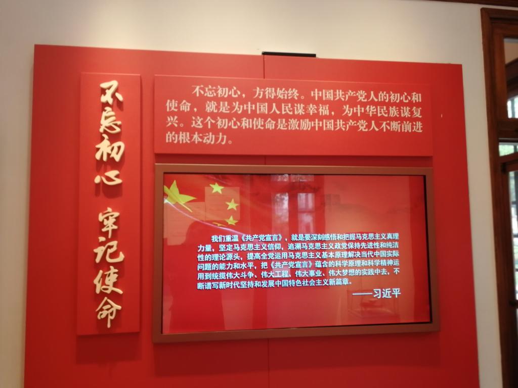管理学院附近,是一栋精致典雅的寓所,陈望道老先生在1956年到1977年间曾居住于此。整个展厅分为宣言展厅、望道展厅和珍档厅,分别展示了陈望道先生对《共产党宣言》翻译工作的贡献,旧居生活的还原和生平轨迹以及藏书手札。走进小楼一层的序厅,陈望道1920年翻译的《共产党宣言》中文首译本浮雕静静陈列,与一件中央编译局赠送的,由《共产党宣言》中文全文排列而成的马恩浮雕宣传品相映成趣。步入宣言展厅,还能看到陈望道曾使用过的桌椅、柜子。从“诞生:阶级使命、人类解放”“共震:华夏命运、道路抉择”“中译:承译巨著,传播火种”到“影响:信仰之源、时代担当”,长设的“宣言中译·信仰之源”主题教育展,系统展示《共产党宣言》的诞生、传播、翻译、版本,及其对中国革命和革命者的巨大影响。沿着褚红色的楼梯向上,二楼望道书房令不少小组成员印象深刻,逼真的蜡像,真实的书房场景还原生动展现了先生工作时的认真勤恳,脸上的微笑让人倍感亲切,书桌上也摆放着先生的成就之一——《辞海》。