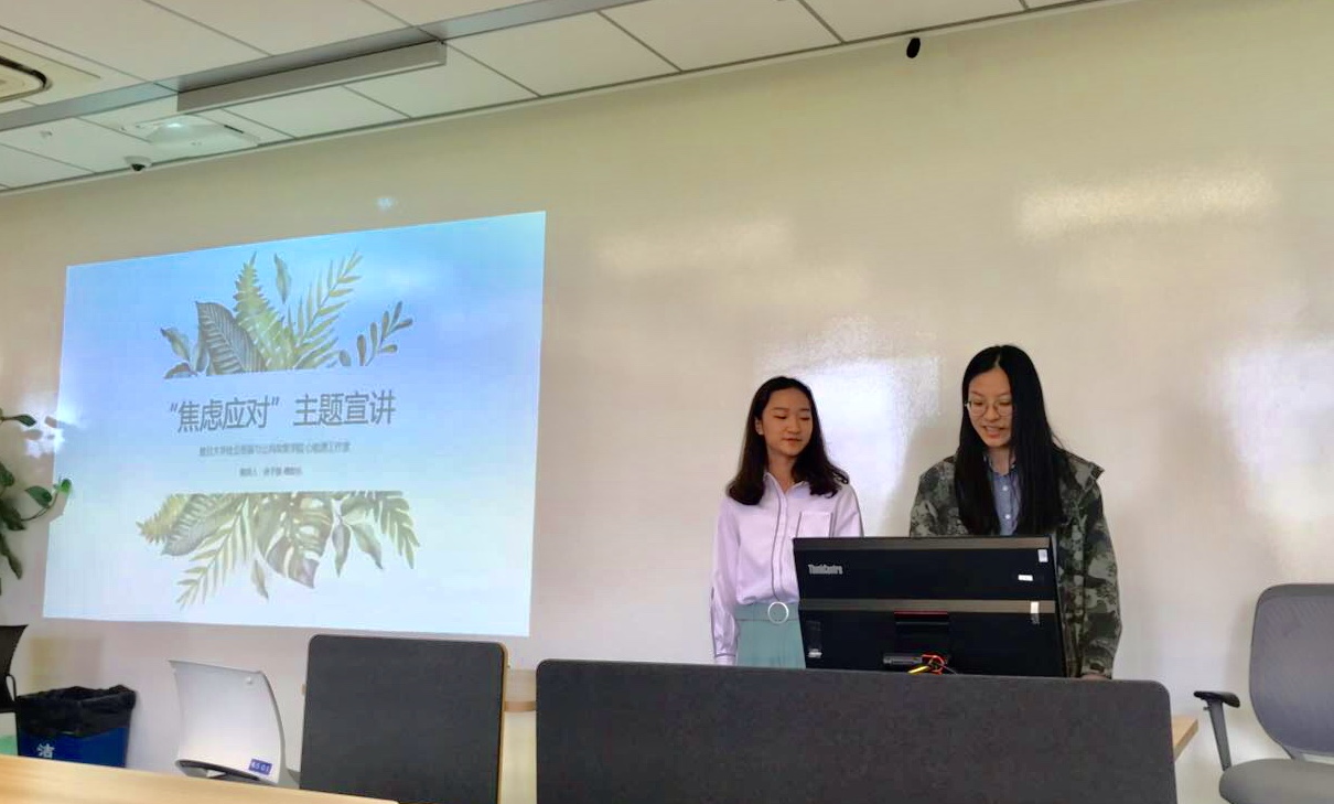 紧接着主讲人正式进入“焦虑应对”主题宣讲,从诱发焦虑情绪产生的心理、社会等因素出发,配合视频讲解,从专业的角度带大家认识焦虑及其表现形式,并介绍了焦虑的两种认知倾向,分别是对未来的可能威胁的担忧以及对自己解决问题能力的不自信。台下的同学一边专注地听,一边时不时微微点头。主讲人还特别介绍了由焦虑引起的两种比较特殊的病症——恐惧障碍和社交障碍,详述了它们的症状和应对方法,帮助大家正确判断,科学应对。