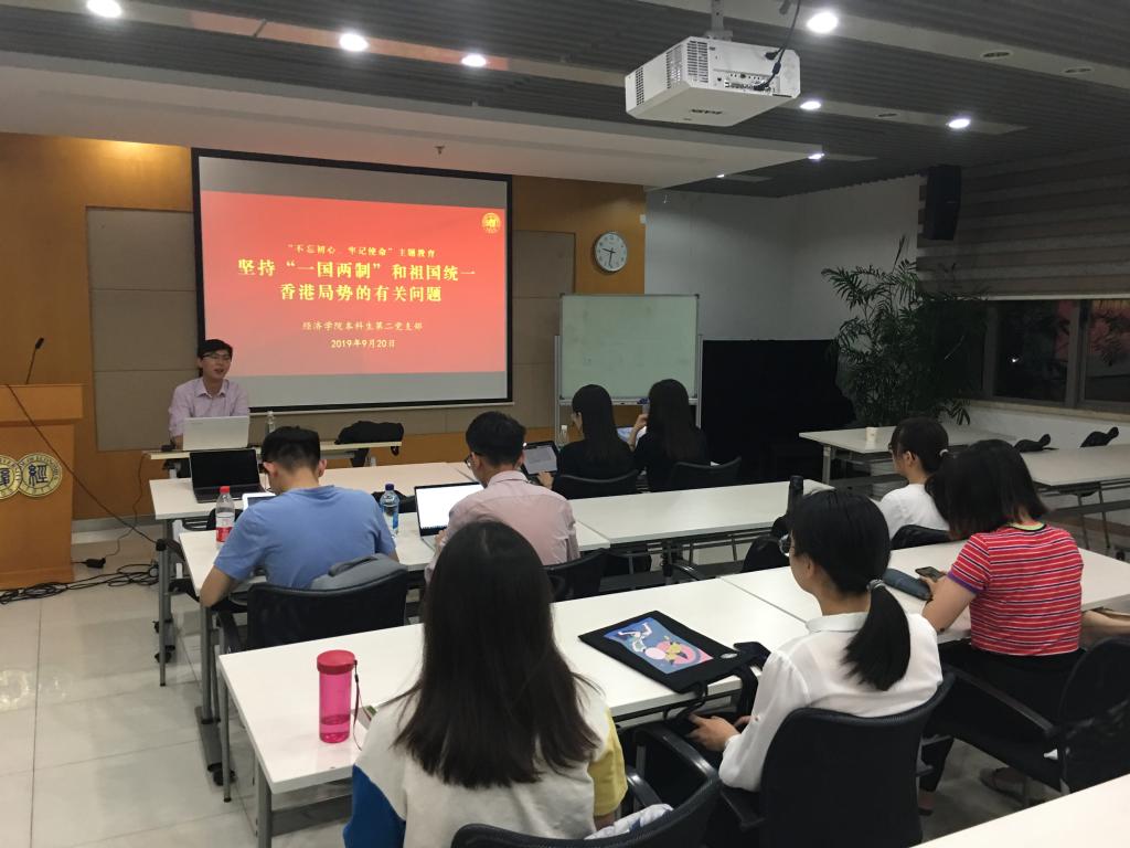 本科第二党支部在泛海楼801举行了“不忘初心、牢记使命”主题教育,针对香港修例问题进行支部书记分享与成员讨论,基本内容主要为四部分,香港修例风波的起源、反修例运动的变迁脉络、中央的基本立场与态度和趋势判断与初步建议。