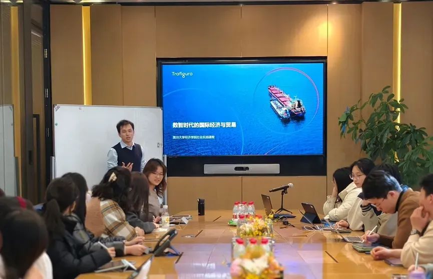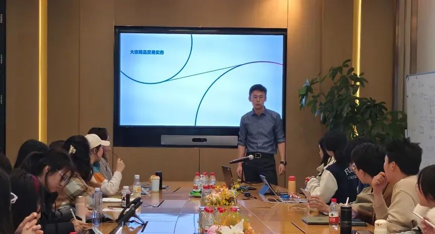 金飞老师、李志远老师带领20位同学前往托克中国进行《社会实践(数智时代的国际经济与贸易)》课程第一次课的学习。本次学习的主题为大宗商品交易简介与交易员日常实操,由托克集团的两位专家Simon Xu和Alan Fan主讲。