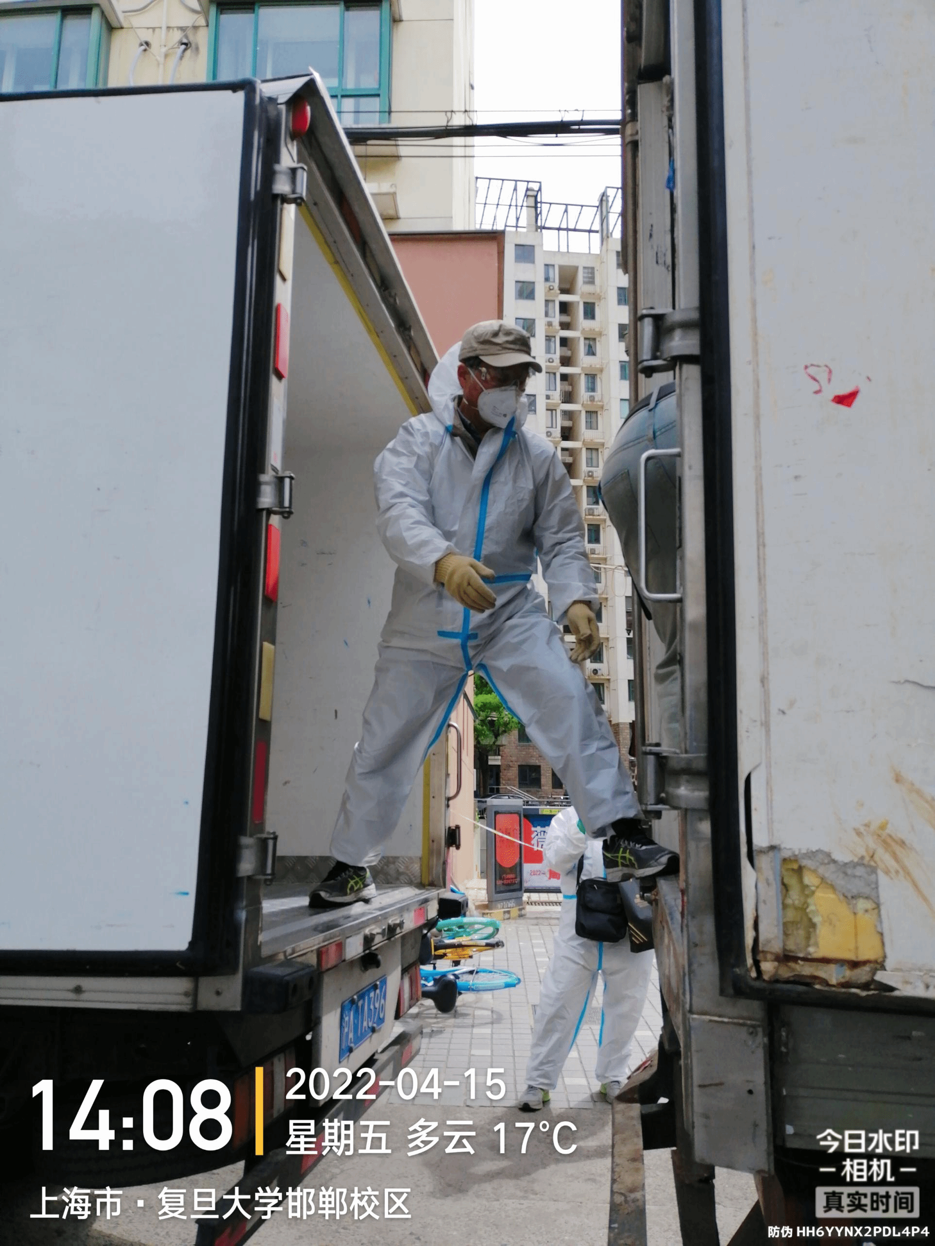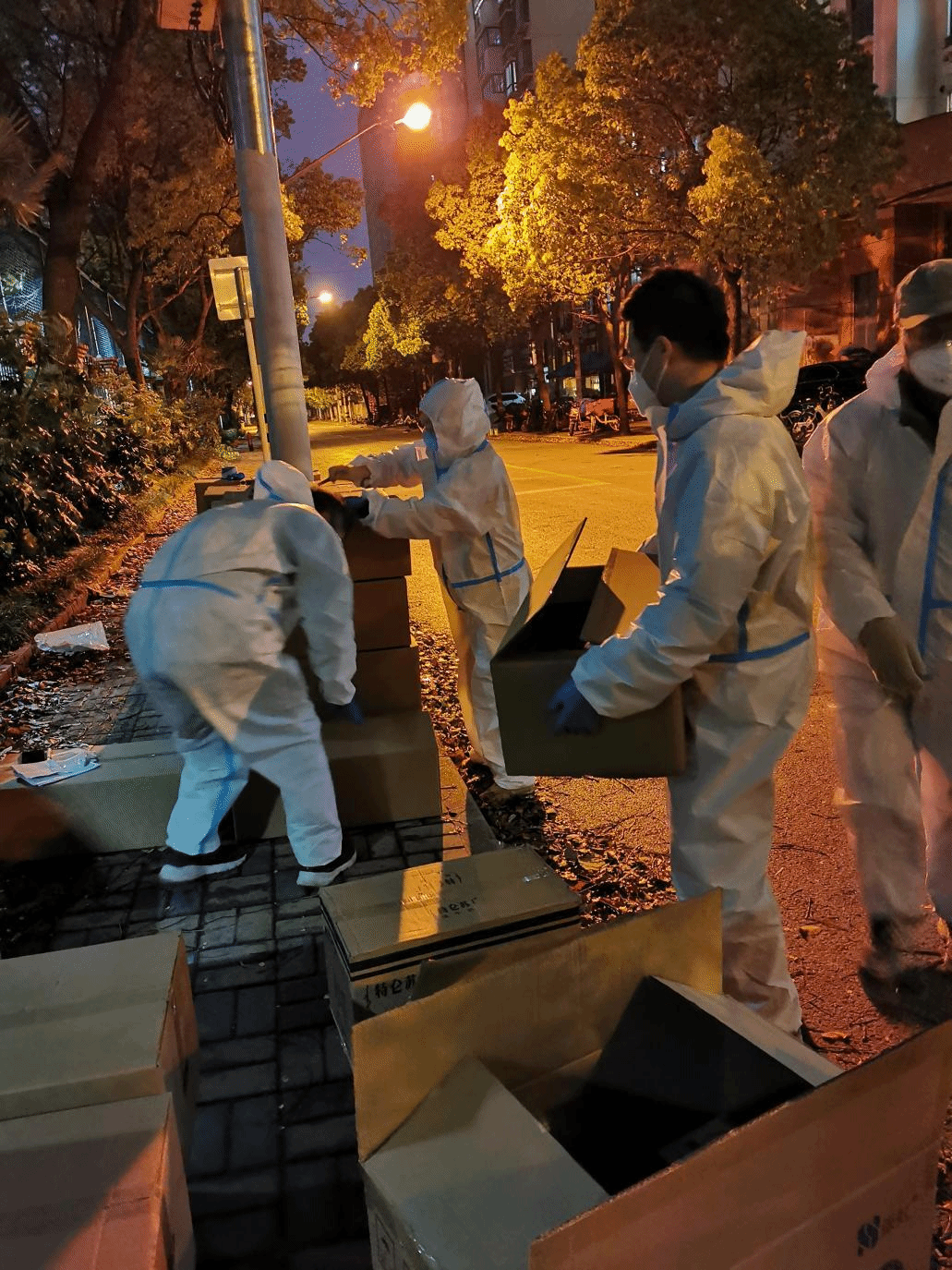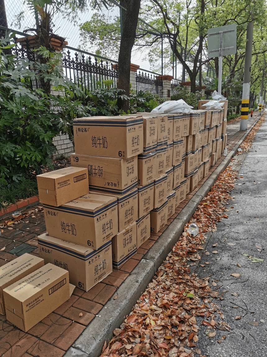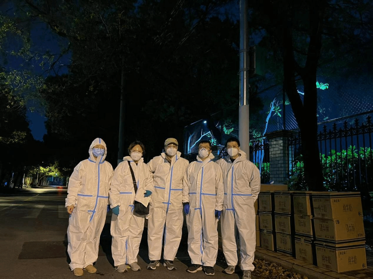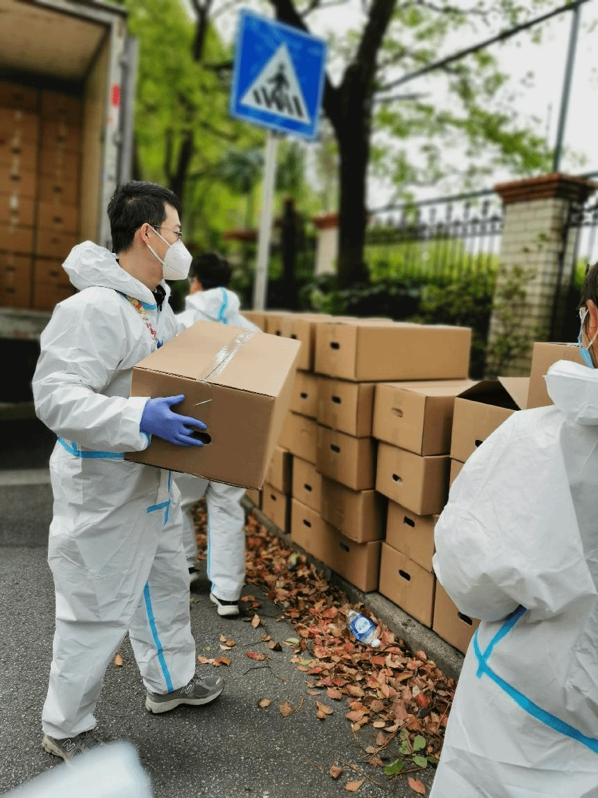 当天上午,由于封闭期间运力紧张,没有专门的仓库及调度进行对接,物资被暂时安置于一小区门口,得知消息后,居住在小区的李粤江、张陆洋、胡琨、高笑梅、朱浩几位老师在取得居委同意后,穿戴好防护服,第一时间赶赴现场进行物资的分拣和发放,拉开了当天爱心接力的序幕。