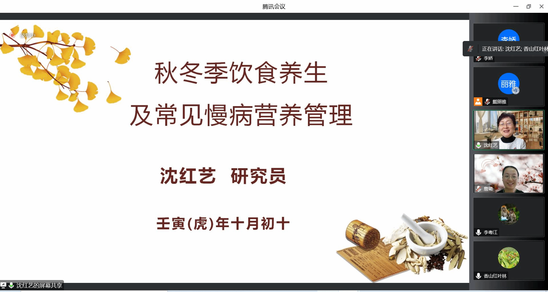 工会邀请了上海中医药大学健康营养研究室主任沈红艺老师开展了“秋冬季饮食养生及常见慢病营养管理”专题讲座。本次讲座由工会主席詹璐主持,学院党委书记李粤江发表致辞,70余名学院教职工及退休教职工踊跃参与了本次讲座。
