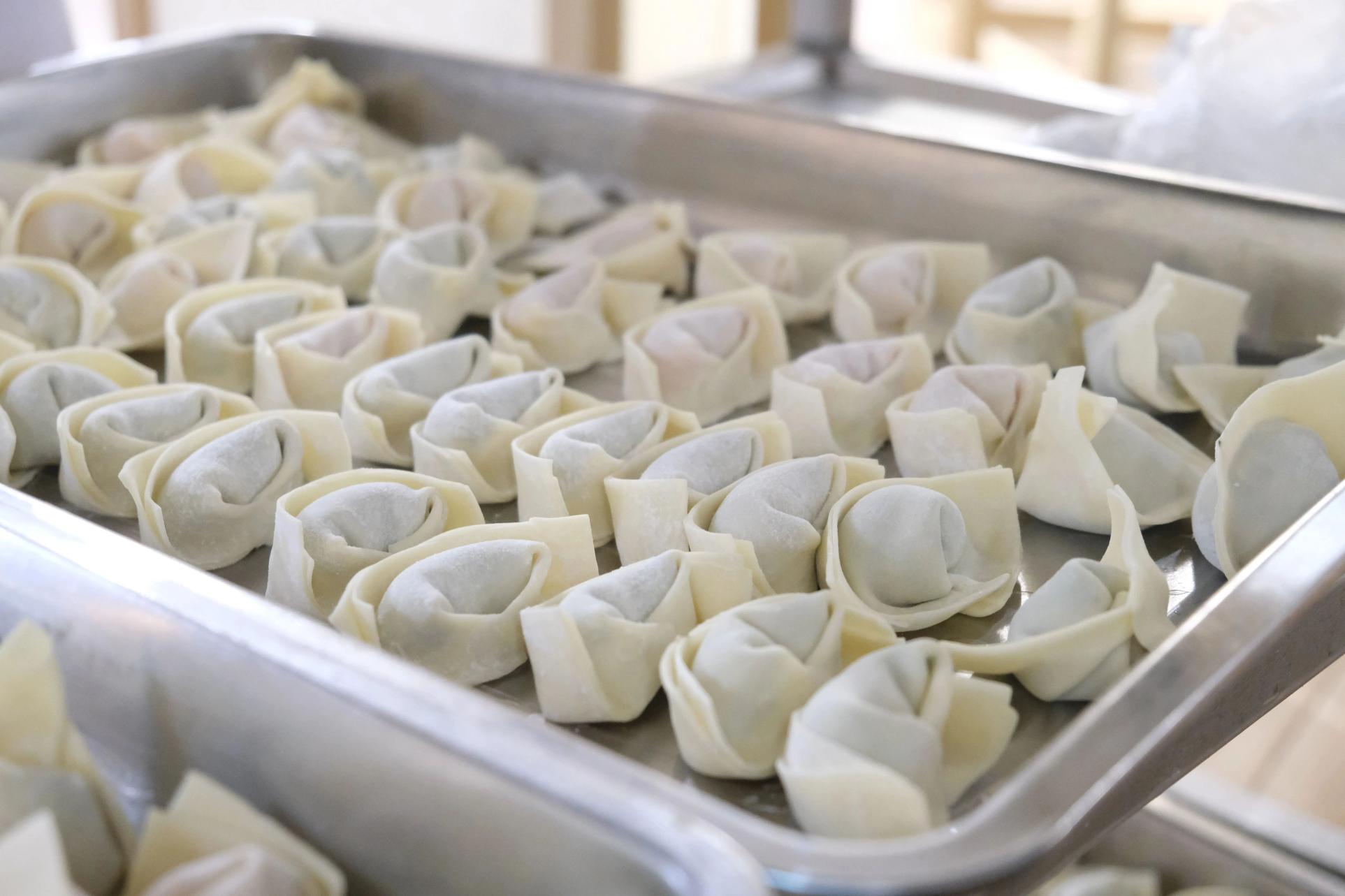 摊皮、放馅、捏形状、成形,大家将馄饨在手中对折、粘角,不一会儿,一个个独具特色又个大饱满的馄饨就摆满了餐桌。
