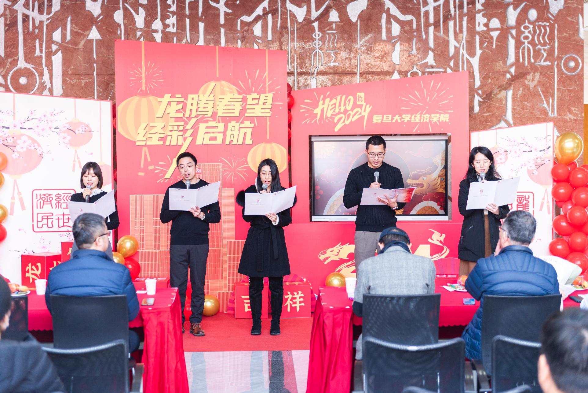 龙舞欢歌,经院荟萃。在喜气祥和的氛围中,教师们各展才艺,带来了精彩纷呈的表演。学院原工会主席严法善老师的一首民谣《可可托海的牧羊人》为大家带来了一种独特而醇厚、纯净而浓烈的听觉盛宴。迎新环节,新进教职工代表纷纷亮相,进行自我介绍并争相献上自己诚挚的新年祝福。颜值与才艺担当的外事新教职工代表极具创意的《影子舞》表演,让在场的教职工们眼前一亮。饱含深情的原创诗朗诵《大写的经院》,表达了“新生代”教职工们对学院的款款深情。欢送环节,光荣退休的教职工代表上台做了热情洋溢的讲话。研究生同学合唱《送你一朵小红花》,感恩德高望重的老一辈经院老师们过去数十年对学院的付出与奉献。四位龙年出生的老师一齐献唱《龙的传人》,歌颂学院百年来人才辈出、薪火相传,送出承前启后、继往开来、再创辉煌的美好祝愿。祝福环节,新生宝宝教职工代表分享了可爱的宝宝照片,孩童的天真烂漫感染了在场的每一位观众。随后,李睿老师弹唱演绎了一曲《平凡之路》,温情而开阔,获得了经久不息的掌声。茶话会最后花儿与少年带来压轴曲目《大中国》,将整场茶话会推向高潮。