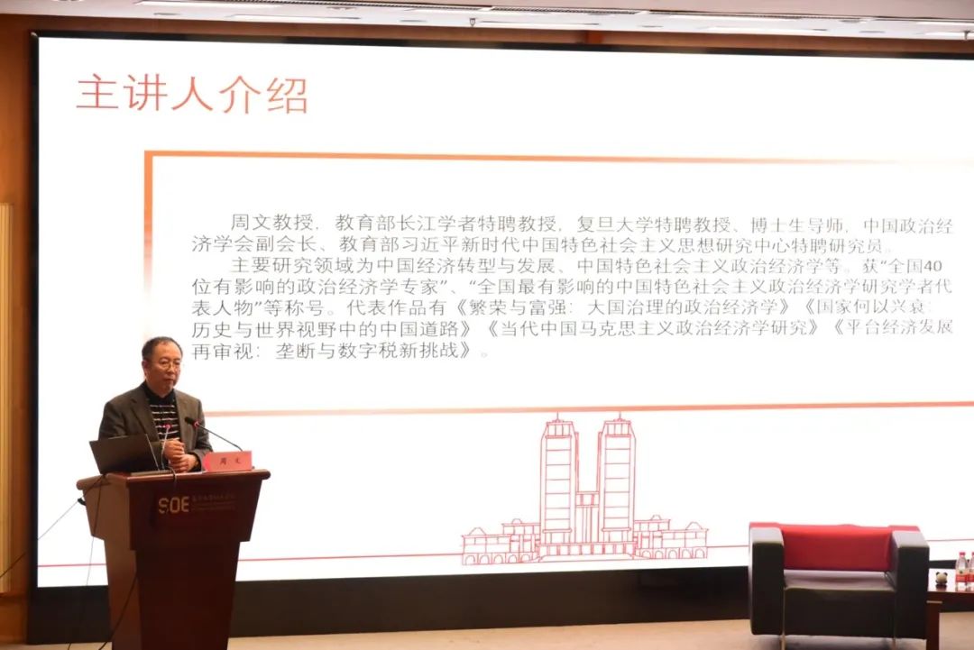 周文教授启发同学们认识到,任何理论都具有时代性和局限性,我们不能神话西方中心论的经济体系,而是要以中国理论解读中国实践,建立中国自主的经济学知识体系,加深对中国特色社会主义的科学性和真理性的认同,从而激励同学们把握新征程上的时与势,进一步坚定"四个自信",增强使命担当。最后,讲座在大家热烈的掌声中圆满结束。