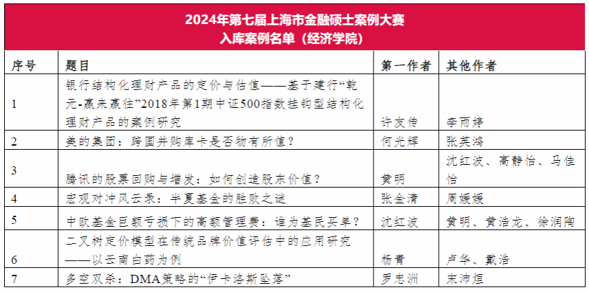 近日,从上海金融教指委传来喜讯,日本av片 许友传老师团队,何光辉老师团队,黄明、沈红波老师团队,张金清老师团队,沈红波、黄明老师团队,杨青、卢华老师团队,罗忠洲老师团队撰写的7篇案例,成功入库2024年第七届上海市金融硕士案例征集(按教指委入库名单顺序)。