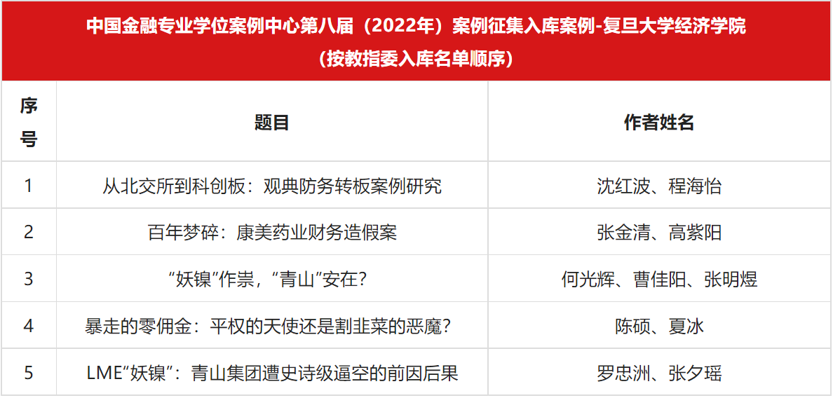 沈红波老师团队、张金清老师团队、何光辉老师团队、陈硕老师团队、罗忠洲老师团队撰写的5篇案例成功入库,成果喜人。祝贺以上老师团队,祝贺学院金融硕士项目!