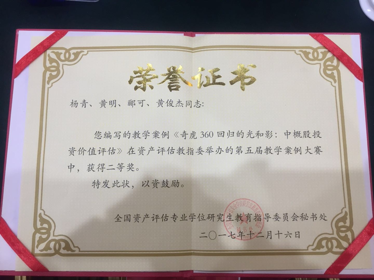 由杨青老师、黄明老师、学生郦可、黄俊杰共同完成的教学案例《奇虎360回归的光和影—中概股投资价值评估》在全国资产评估教指委举办的第五届教学案例大赛中荣获二等奖!这也是日本av片