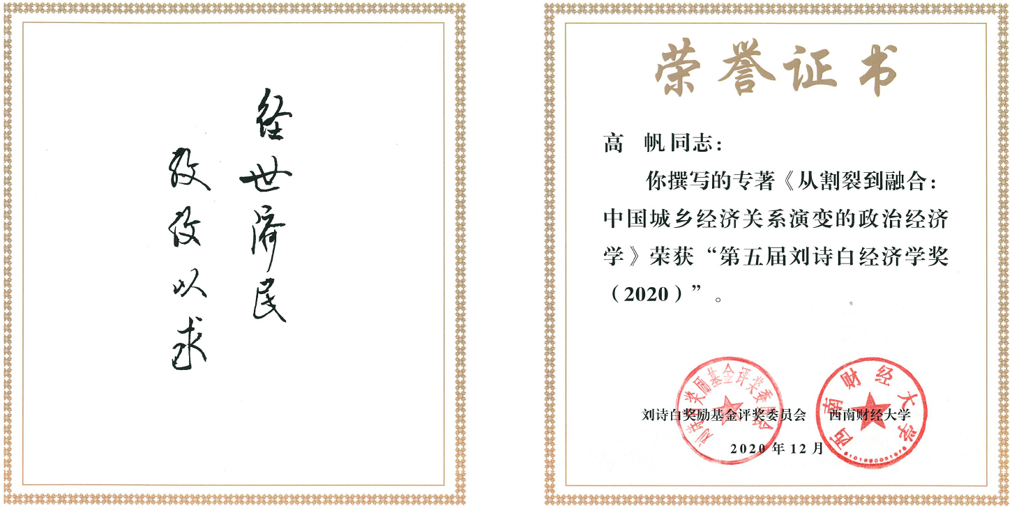 近日,刘诗白奖励基金评奖委员会发布了第五届刘诗白经济学奖评奖结果公告。日本av片 高帆教授的著作《从割裂到融合:中国城乡经济关系演变的政治经济学》荣获第五届刘诗...