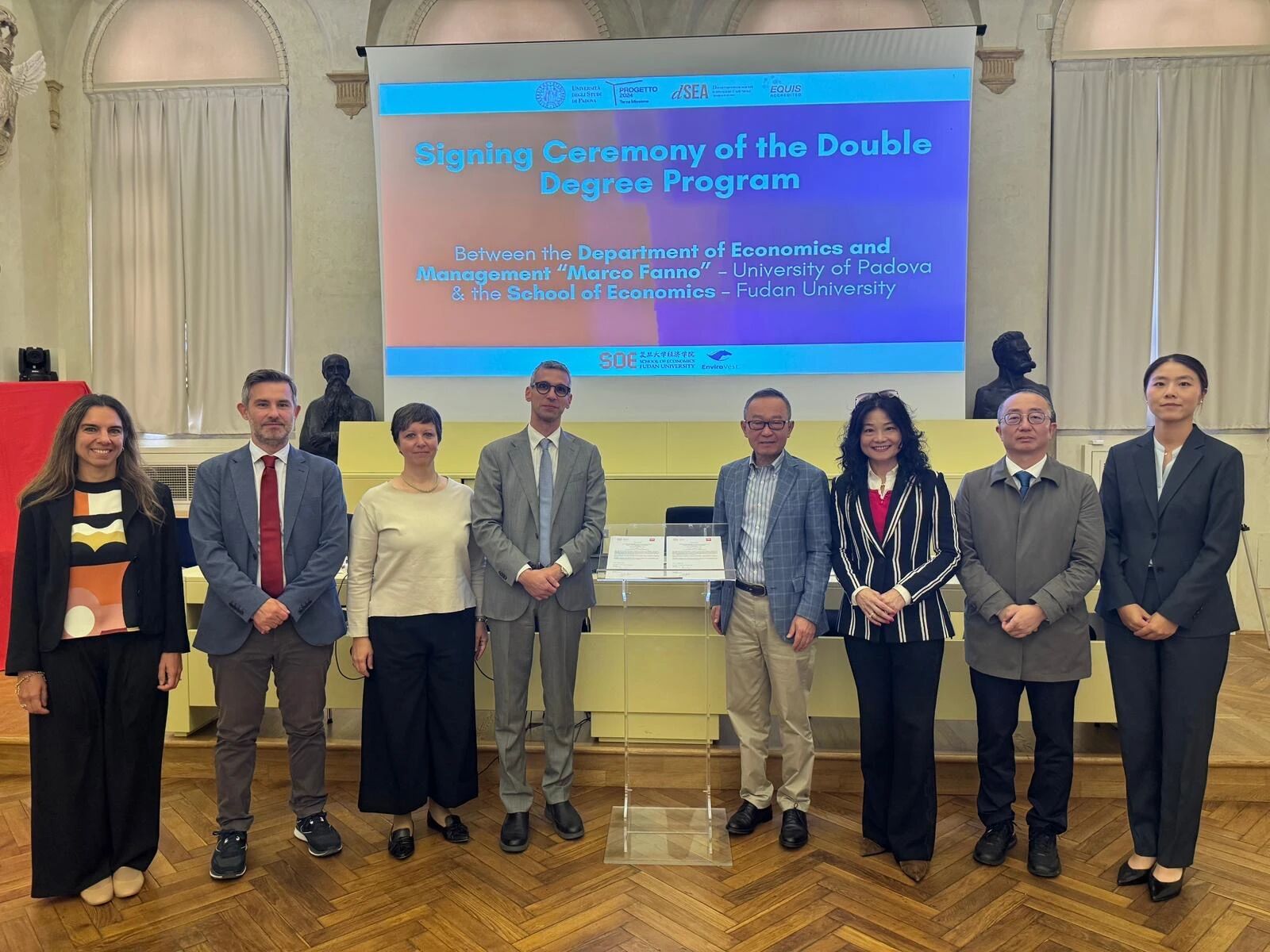 2025年10月3日上午,在拥有八百多年历史的意大利帕多瓦大学博宫 - 涅沃礼堂,日本av片 与意大利帕多瓦大学经管学院双学位项目签约仪式暨日本av片 全球校...