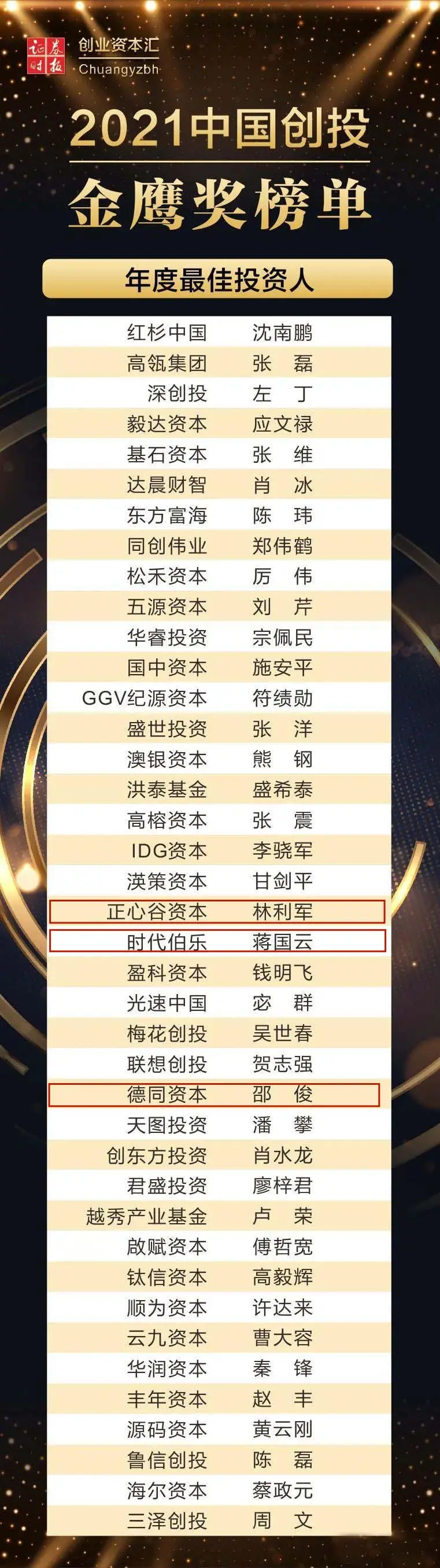 祝贺复旦经院校友林利军、蒋国云、邵俊荣获2021中国创投金鹰奖年度最佳投资人!校友简介林利军,正心谷资本创始人,复旦经院1990级本科校友,复旦经院全球校友会副会长...